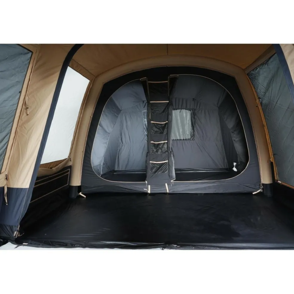 Voor de leefruimte ligt een royale, afsluitbare luifel (ca. 185 x 310 cm) met combiwand. U kookt of zit hier beschut, terwijl de wegrolbare zij-ingangen met horramen prettig doorluchten. De leefruimte zelf (ca. 180 x 310 cm) heeft een extra brede voordeur en een zij-ingang, waardoor u uw indeling flexibel houdt. Met een stahoogte tot 225 cm voelt de tent ruimtelijk aan en beweegt u zich makkelijk.