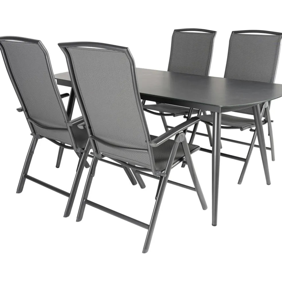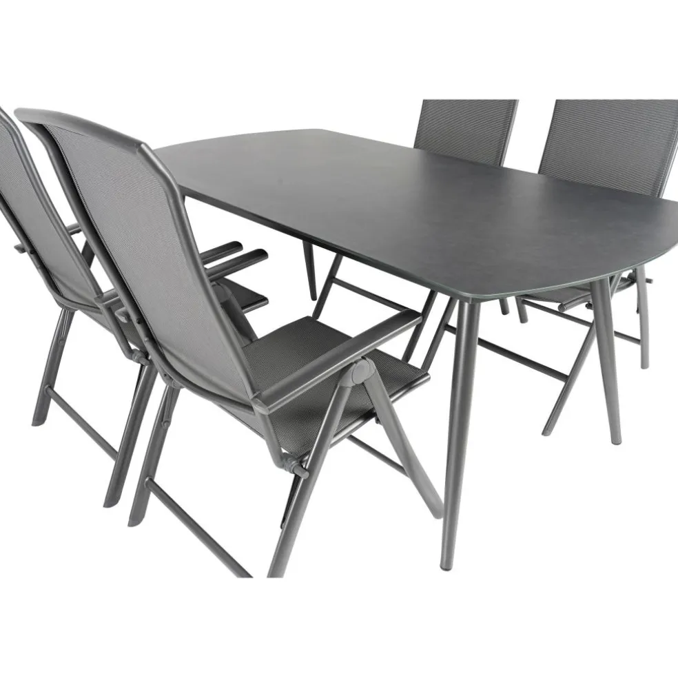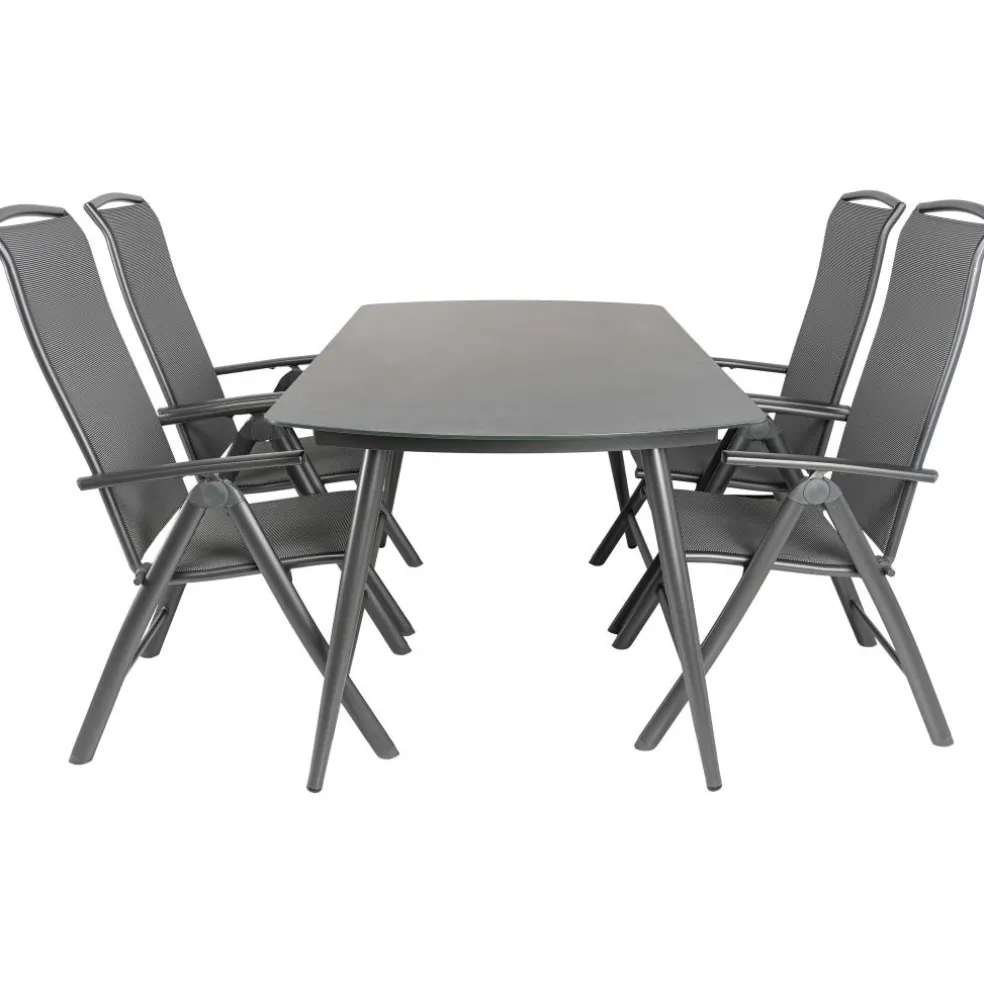 De Bardani Olivia 180 x 100 cm Capri 4 tuinset bestaat uit een moderne tuintafel met 4 verstelbare tuinstoelen. De rechthoekige tafel heeft een sterk frame van aluminium met een hoogwaardig glazen tafelblad. De lichtgewicht verstelbare tuinstoelen hebben een frame van aluminium en de zitting en rugleuning zijn van textileen materiaal. Hierdoor is de tuinset onderhoudsarm en heeft een lange levensduur.