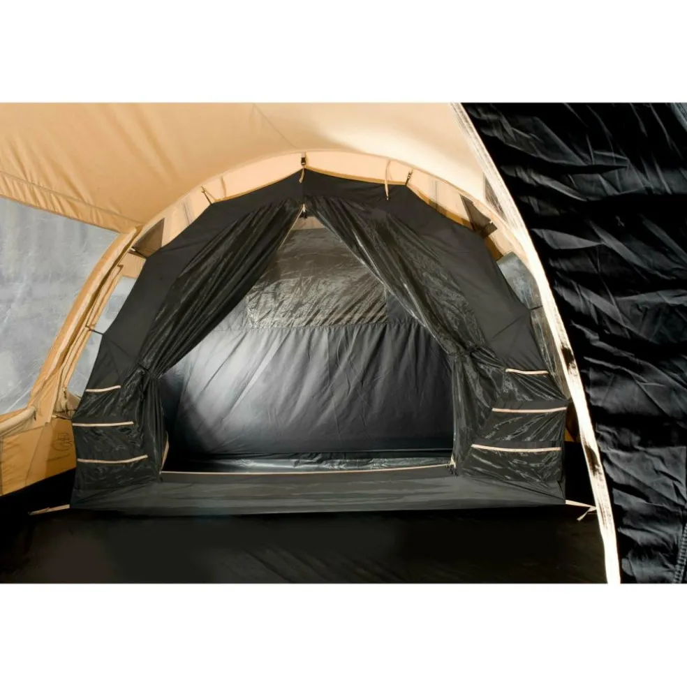 Het buitendoek bestaat uit ademend RSTC (ripstop technical cotton): sterk, stil bij wind en minder benauwd dan volledig polyester. Dat merkt u aan een rustiger binnenklimaat en minder condens. De binnentent is van ademend technisch katoen, waardoor de slaapcabines donker en koeler blijven. Met een 5.000 mm waterkolom en een vast kuipgrondzeil van Oxford polyester blijft de leefruimte droog op nat gras en houden u en uw bagage droge voeten. Het frame bestaat uit aluminium boogstokken; licht, stijf en vormvast, dus prettig bij op- en afbouw én betrouwbaar bij wind.