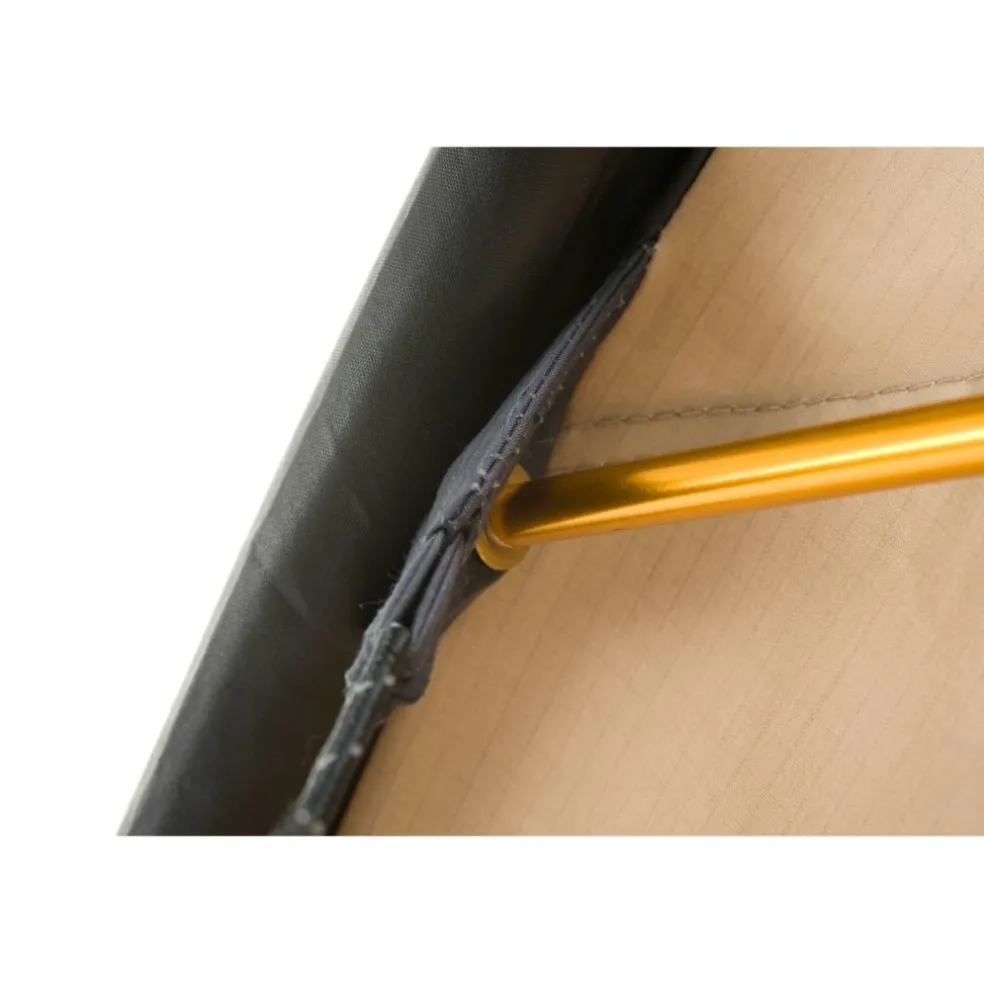 De lichtgewicht aluminium boogstokken geven de tent een windvaste tunnelconstructie met een lager gewicht dan staal. Met een vastgestikt polyester grondzeil in de leefruimte en een 5.000 mm waterkolom houdt u vuil, tocht en opspattend water buiten, zodat u ook bij nat weer droog en comfortabel blijft.