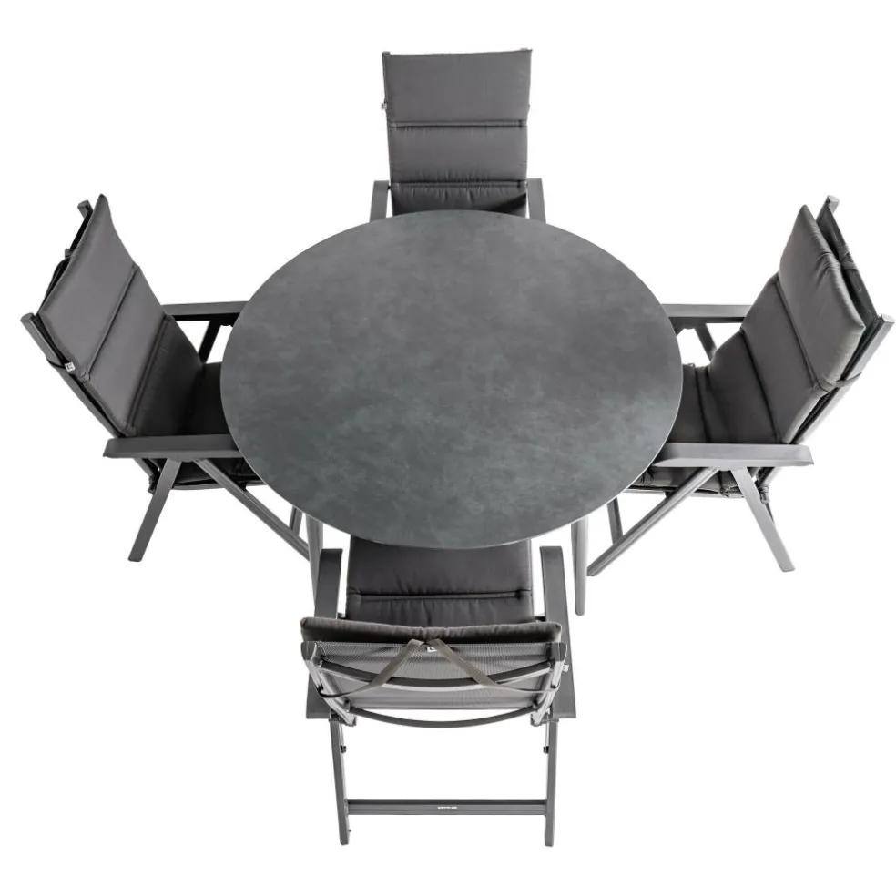 Met de Bardani Verdi Basic ø 130 cm tuinset wordt buiten zitten zeer comfortabel tijdens de mooie dagen. De tuinset bestaat uit 4 Basic verstelbare stoelen en een grote Verdi tafel met een diameter van ø 130 cm. Maak uw tuin helemaal compleet met deze moderne Bardani tuinset!
