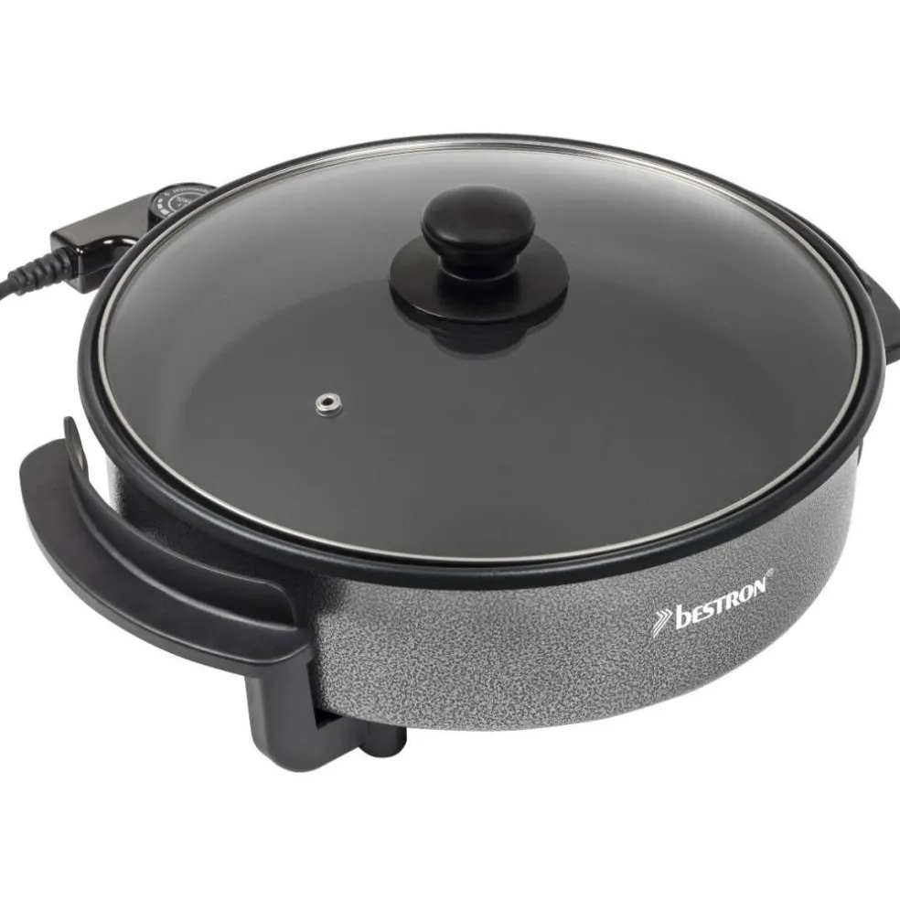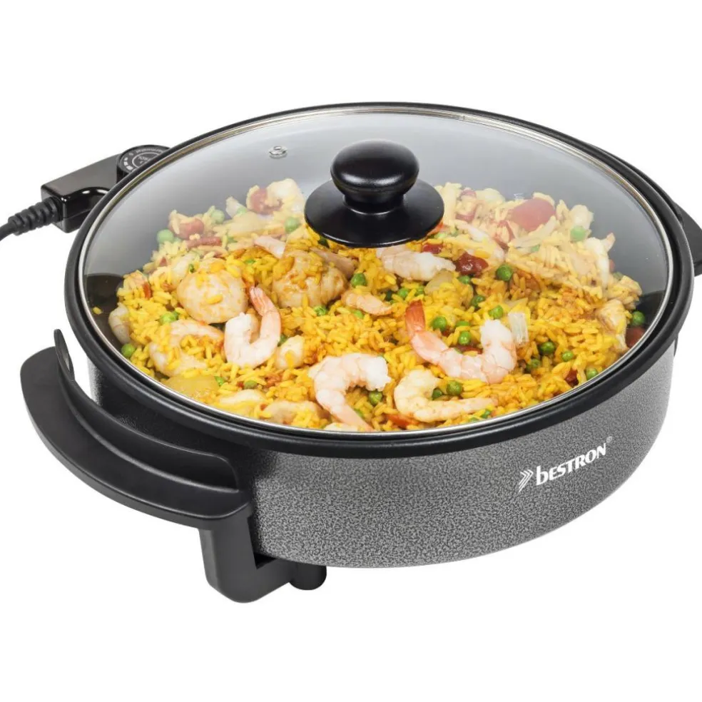 De Bestron AHP1200 Hapjespan is een multifunctionele pan voor onder andere braden, bakken en warmhouden. De hapjespan heeft een extra hoge rand en is daardoor uitermate geschikt voor het bereiden van pasta, paella, etc. De Bestron hapjespan beschikt over een afneembare regelbare thermostaat met gereed-indicatielampje en is voorzien van een antiaanbaklaag. Daarnaast beschikt de hapjespan over een glazen deksel met stoomuitlaat en een handgrepen. De handgrepen zijn hittebestendig. De pan is geschikt voor de vaatwasser en hierdoor gemakkelijk te reinigen. Door de antislipvoetjes blijft de pan stabiel staan. De hapjespan heeft een vermogen van 1500 watt en kan aangesloten op 220-240 volt. De Bestron hapjespan wordt geleverd met een uitgebreid serveersuggesties in een boekje.
