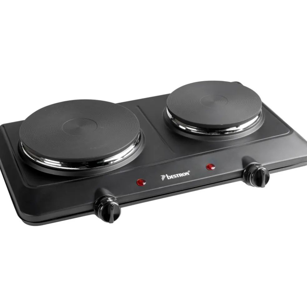 De Bestron Dubbele Kookplaat is gemaakt van gietijzer en heeft indicatielampjes wanneer deze aan staat. Deze kookplaat heeft twee plekken voor uw pan met verschillende groottes. De plaat van 18 centimeter produceert 1500 Watt en de plaat van 15 centimeter produceert 750 watt. De temperatuur kunt u instellen met de automatische thermostaat. Deze kookplaat heeft antislippootjes zodat deze niet wegschuift.