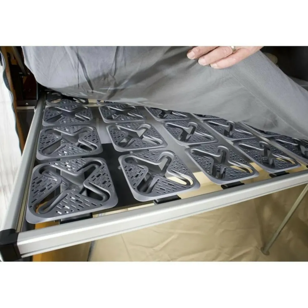 De slaapcabine is zeer uitgebreid, met een froli-bedsysteem, een ruim tweepersoonsmatras van 220 bij 200 cm van koudschuim, donker tentdoek en horrengaas. Hierdoor zult u heerlijk slapen in deze vouwwagen, ook als u wat langer bent.