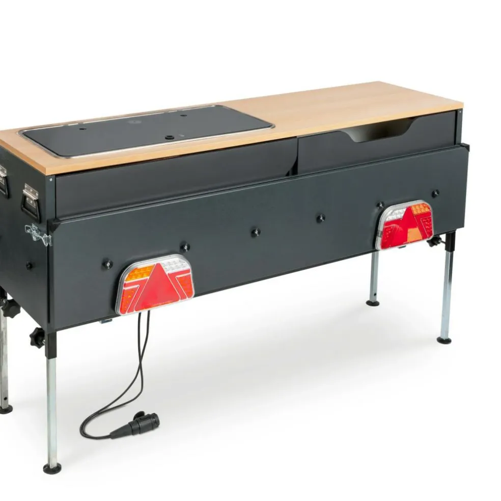 Bij deze Cabanon vouwwagen ontvangt u een luxe bermkeuken met veel opbergruimte en genoeg werkruimte. Met deze keuken kunt u ook op vakantie lekkere maaltijden bereiden.
