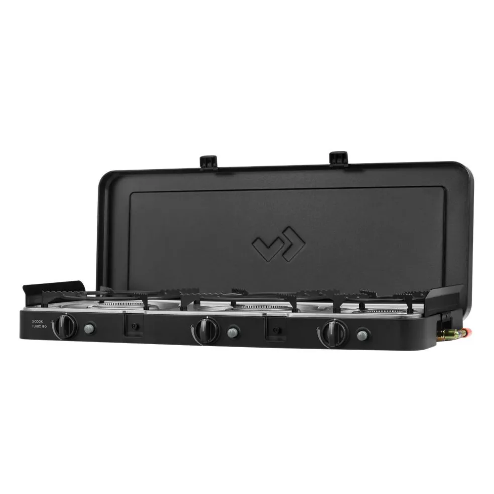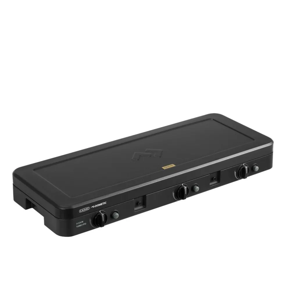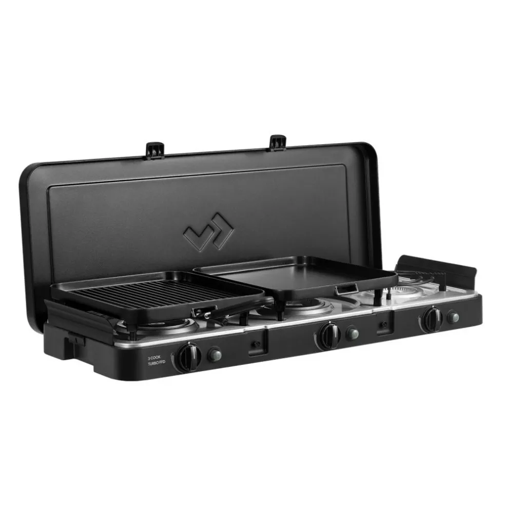 Dit 3 Cook Turbo FFD Deluxe 3-pits kooktoestel van Cadac is uitgerust met een pandrager, een bakplaat, een grillplaat, windschermen en een opbergtas. Dankzij de thermische beveiliging kunt u veilig in uw tent of caravan koken, maar ook buiten maakt u moeiteloos gebruik van het toestel, vanwege de windschermen en de diep gelegen branders.