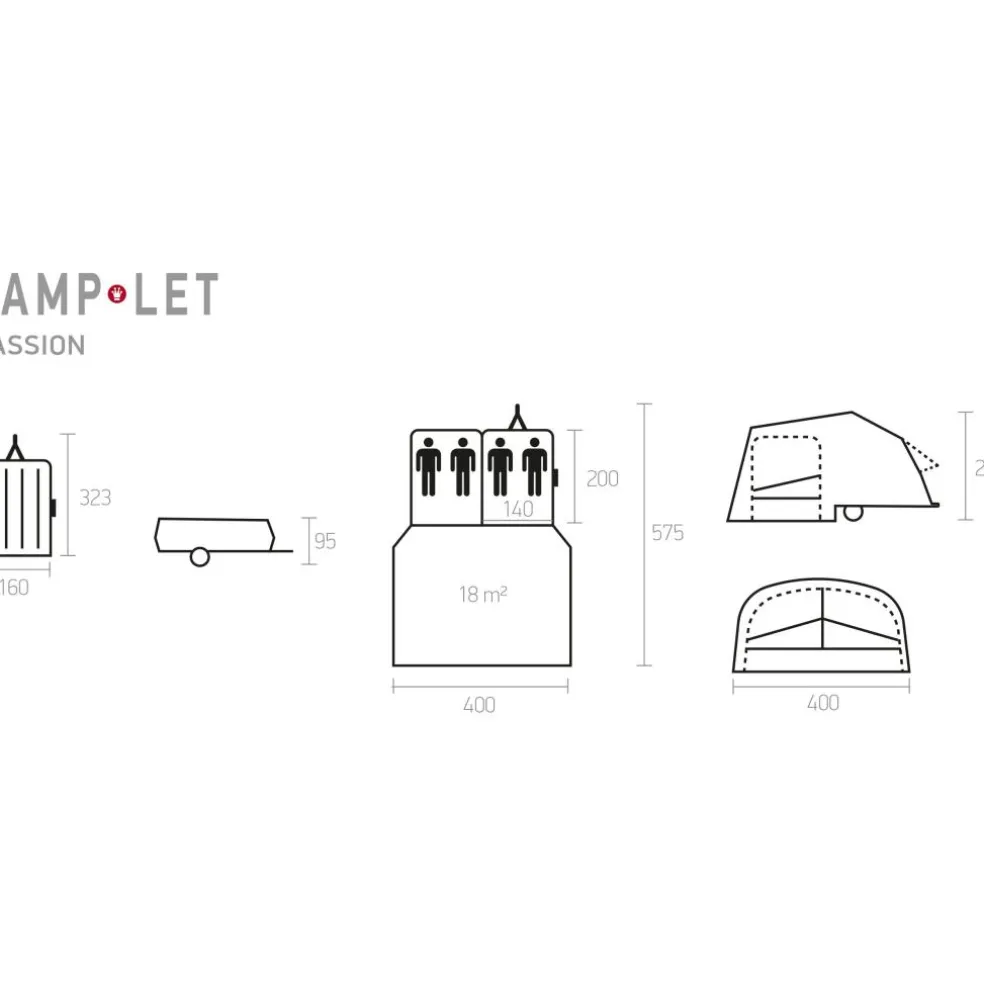 Door het praktische ontwerp is deze Camp-let vouwwagen makkelijk op te zetten binnen 15 tot 20 minuten. De slaapcabines zijn in één handeling op te zetten. Verder zorgt het duurzame materiaal ervoor dat regen, wind en zon buiten de tent blijft, want de wand en dak zijn voorzien van een waterafstotende coating. De Camp-let vouwwagen heeft een ongeremd ledig gewicht van 270 kg en een geremd ledig gewicht van 295 kg. De wagen is te verkrijgen in ongeremd 500 kg en geremd 500 kg en 750 kg.