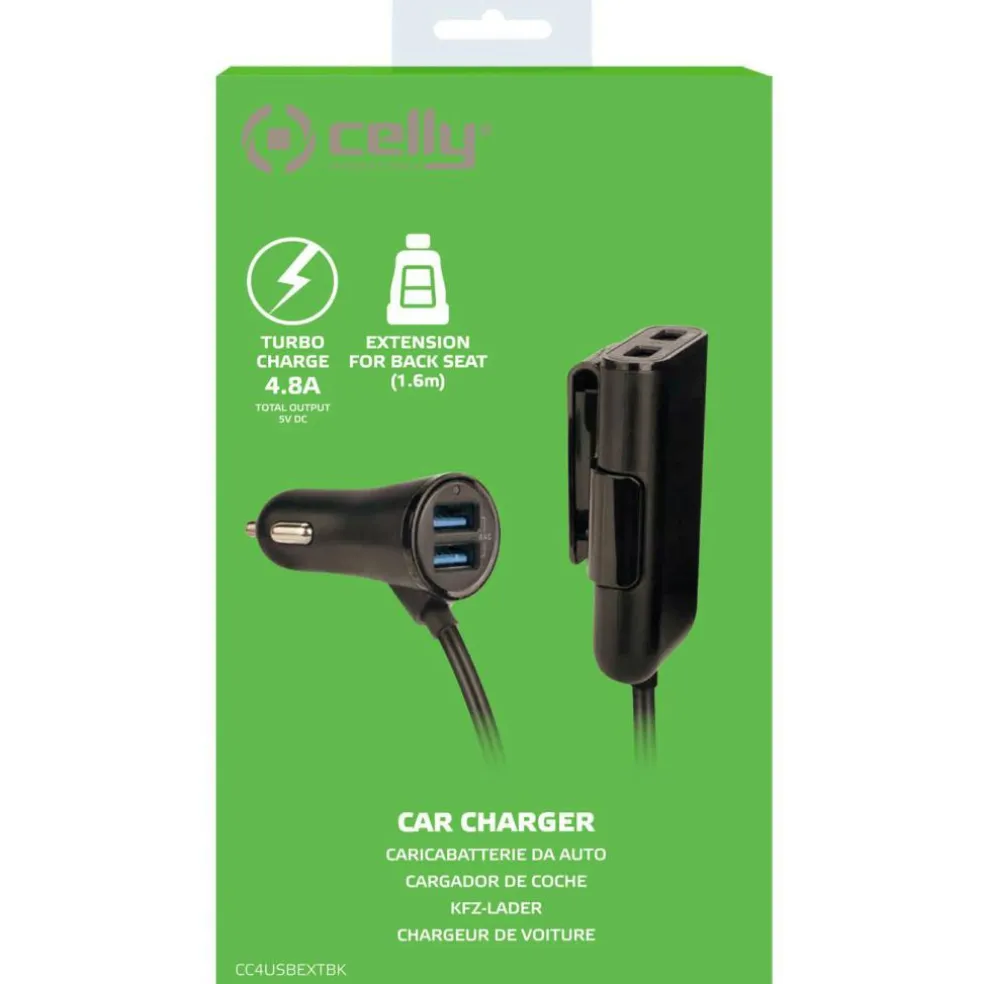 De Celly USB 4.8 4 poorten universele autolader is ideaal om snel tot 4 apparaten tegelijk op te laden. De oplader is uitgerust met twee USB poorten aan de voorzijde en een verlengstuk van 1,6 meter met twee USB poorten.