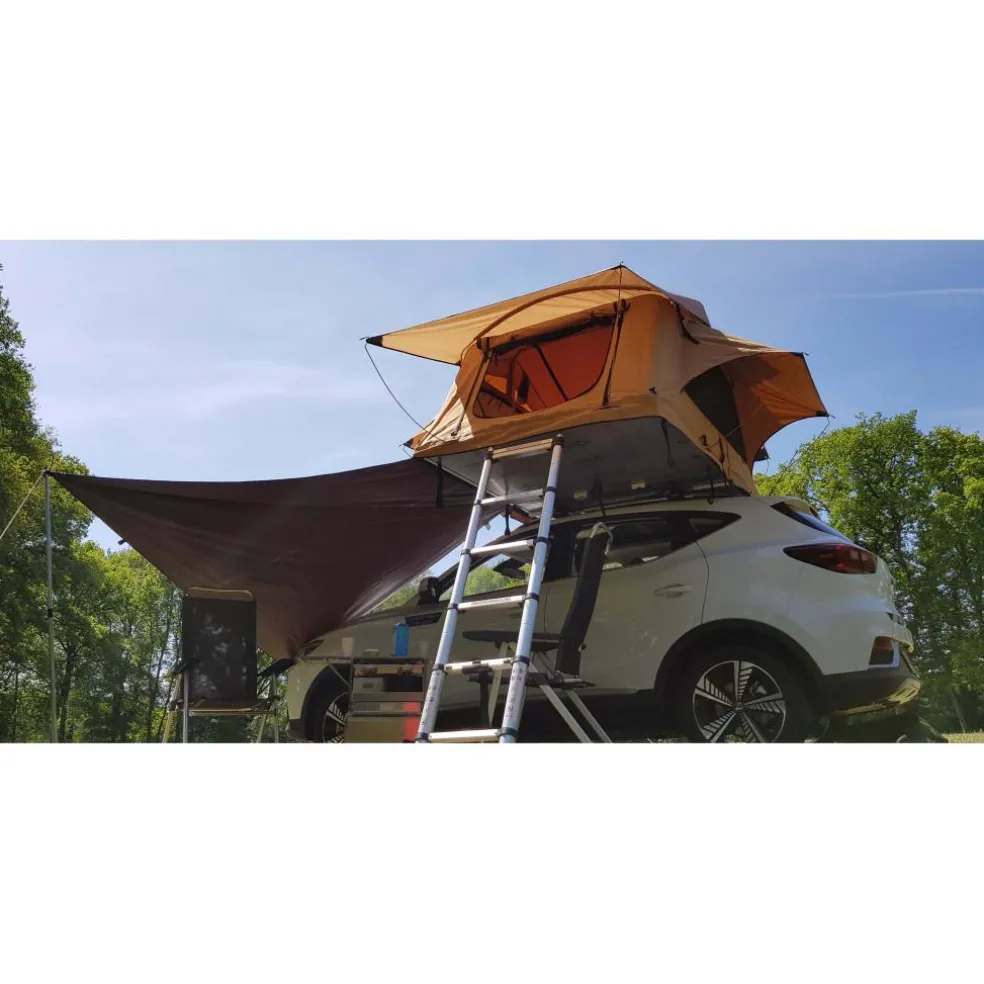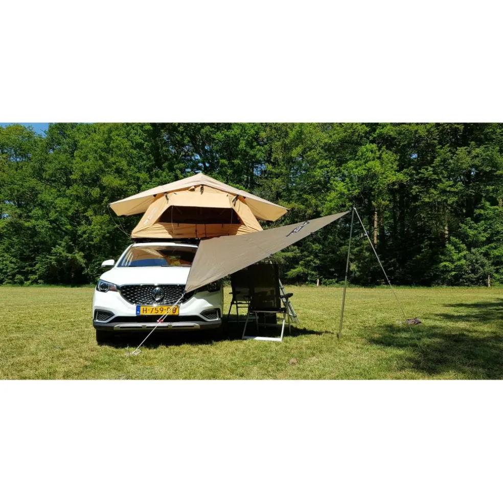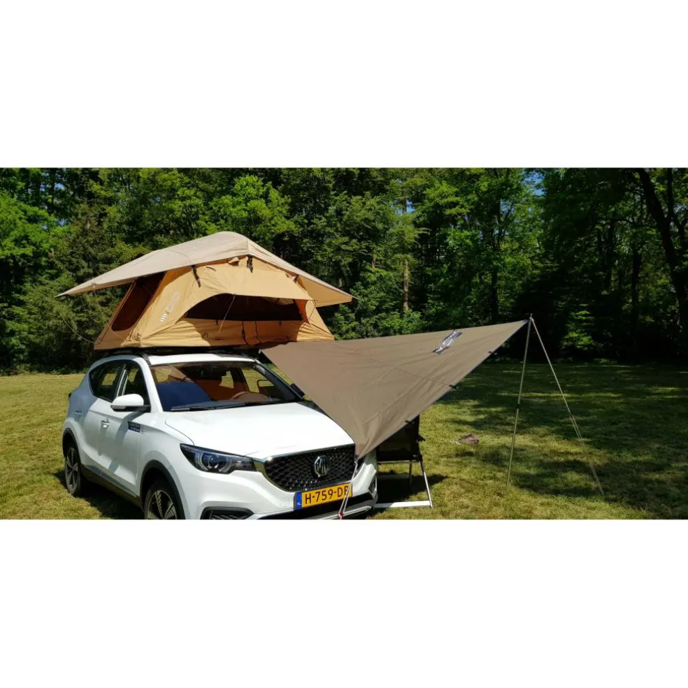 Met de Dare to be Different Outdoor schuifwand in de kleur groen kunt u een beschut plekje creëren om uit de zon en regen te zitten. Deze Dare to be Different Outdoor schuifwand is binnen 3 minuten opgezet en is gemaakt van 300g canvan met een PU-coating. Dit materiaal is waterdicht tot 2500mm, ripstop en UV-bestendig. Bij deze schuifwand ontvangt u 5 haringen en scheerlijnen. Daarnaast is de schuifwand trapeziumvormig, met een kader pees van 125 cm, waarmee u de wand kunt bevestigen aan de peesrand aan de onderzijde van de daktent. U kunt optioneel de schuifwand omtoveren tot een luifel met een los verkrijgbare tentstok.