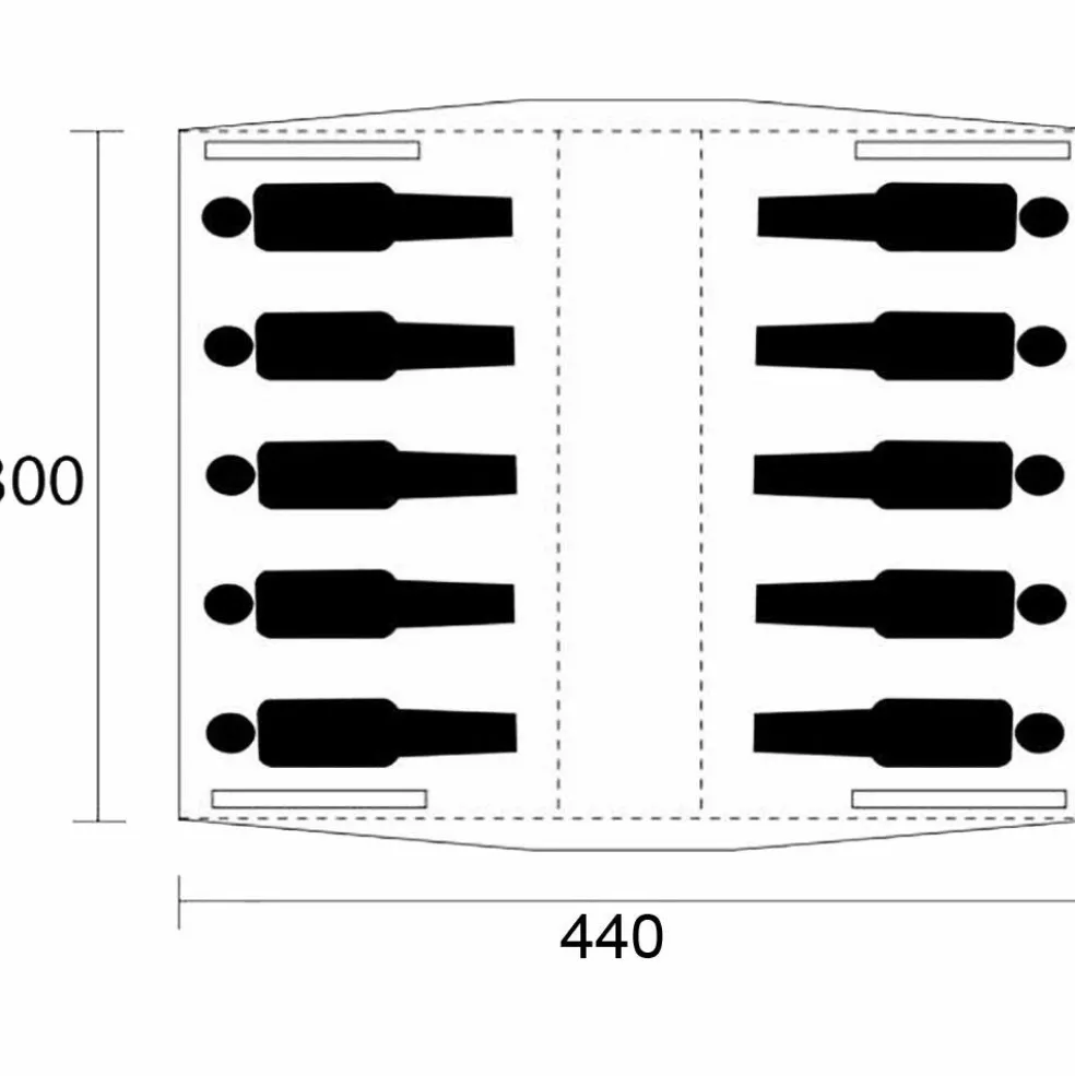 De Kalahari Super heeft één grote binnenruimte van 300 x 440 cm. Als open slaapzaal biedt deze plek aan maximaal acht matjes of luchtbedden naast elkaar, met in het midden nog looppad. De deuren aan beide zijden maken in- en uitlopen eenvoudig en creëren een natuurlijke doorstroom van lucht. De geïntegreerde horramen zorgen voor frisse lucht zonder ongewenste gasten. Dankzij de rechte wanden en het vaste kuipgrondzeil blijft de volledige vloeroppervlakte bruikbaar.