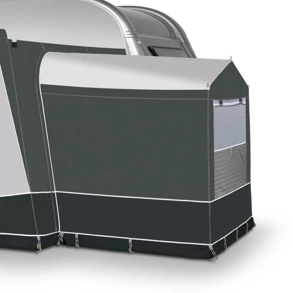 Met deze Dorema Garda standaard uitbouw vergroot u moeiteloos het vloeroppervlak van uw voortent. De uitbouw behoudt zijn volledige hoogte tot aan de achterzijde en is voorzien van een raam ter hoogte van de achterwand. Dit raam is uitgerust met ventilatiegaas dat eenvoudig afsluitbaar is middels een transparante folieklep. De uitbouw is flexibel te plaatsen aan zowel de linker- als de rechterzijwand, stevig bevestigd met een spiraalritssluiting. Bovendien kan de zijwand van uw caravan voortent als standaard scheidingswand blijven dienen. Geschikt voor diverse voortenten, waaronder de Dorema President 250, Dorema President XL280, Dorema President XL300, Dorema Royal 350, Dorema Garda 240, Dorema Garda 240 De Luxe, Dorema Garda XL270, en Dorema Garda XL300.
