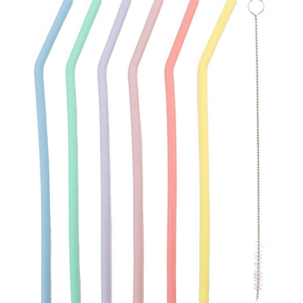 Deze Dotz gebogen siliconen rietjes worden geleverd per set van zes, inclusief een handig schoonmaakborsteltje. De herbruikbare rietjes hebben vrolijke kleuren en zijn een duurzaam alternatief voor wegwerpvarianten.