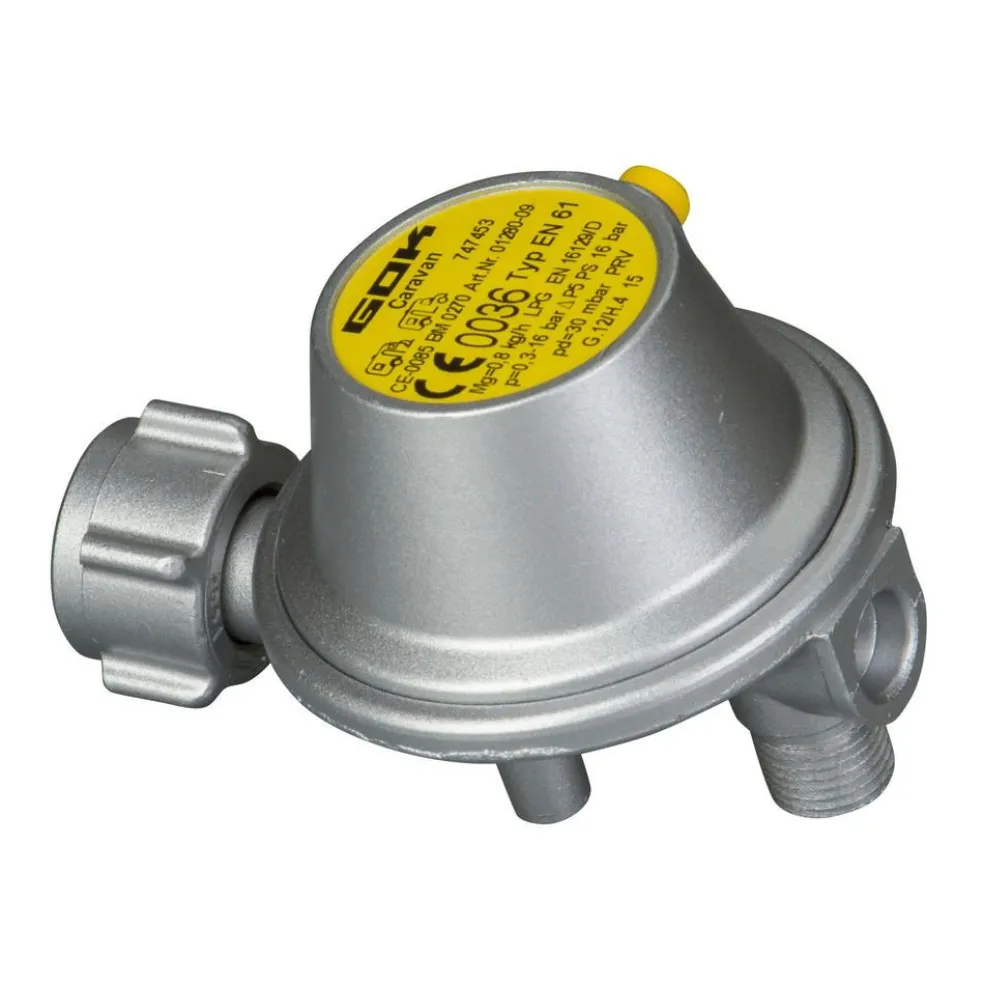De veiligheidsregelaar haaks 30 mbar met 1/4 linkse aansluiting van GOK zorgt voor meer veiligheid. Deze haakse aansluiting met overdrukventiel is bedoeld om ontploffing van de drukregelaar te voorkomen. Dit product is geschikt voor DIN en SHELL propaanflessen. Deze veiligheidsregelaar is uitsluitend toegestaan in een disselbak of geventileerde gasflesruimtes. Een drukregelaar koppelt een gasfles aan de gasinstallatie en zorgt voor de constante en juiste druk op de aangesloten apparatuur. De reguliere druk op een gasfles is bij 15 graden Celsius circa 7 bar.