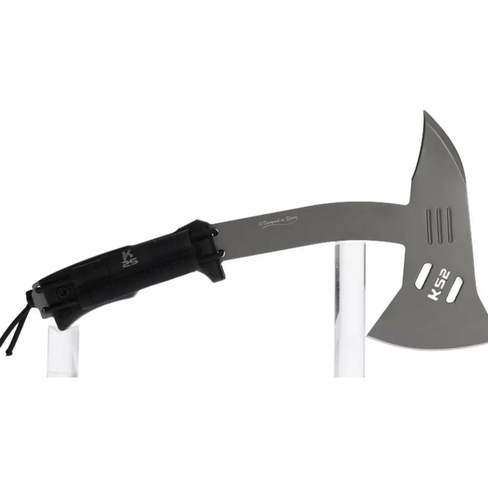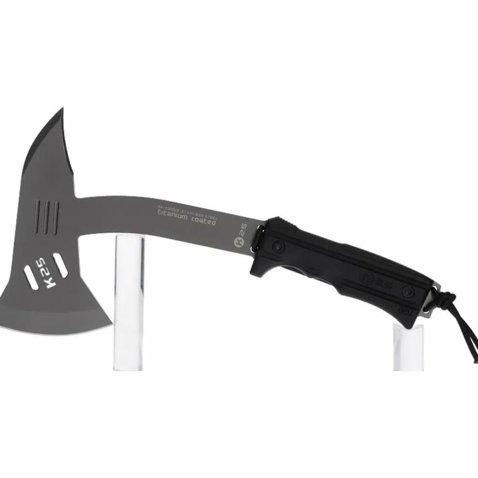 De K25 Tactical Axe 32023 is een veelzijdige bijl die bijvoorbeeld ideaal is voor het kloven van hout tijdens het kamperen. De bijlkop heeft een doorsnede van 9 cm, een dikte van 4,8 mm en is gemaakt van RVS met een titanium coating. Dit maakt het een erg duurzame bijl die lang meegaat. Bovendien wordt de bijl geleverd met een polsriem en nylon schede, zodat u deze veilig op kunt bergen.