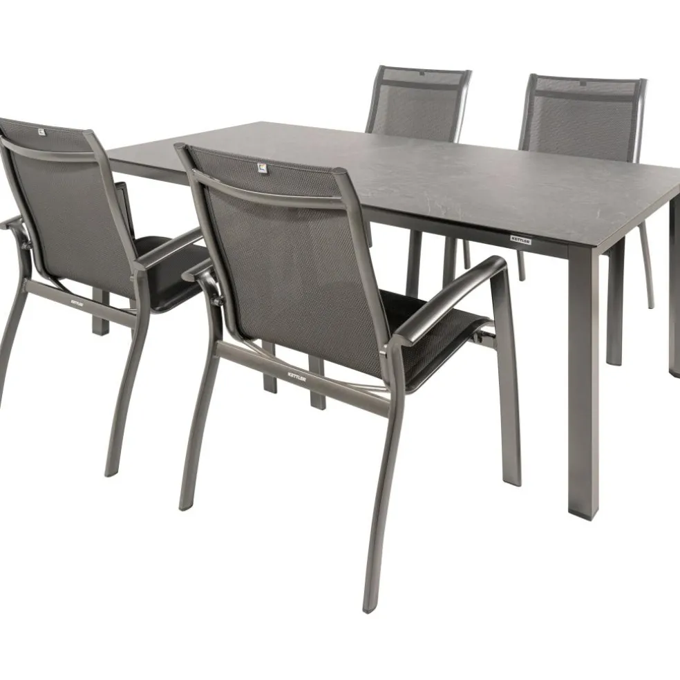 De Kettler HPL 180 Legato 4 verstelbaar tuinset jura antraciet omvat een HPL tuintafel en vier stapelbare Legato tuinstoelen. De tafel is vervaardigd van High Pressure Laminate met een aluminium onderstel, biedt duurzaamheid, eenvoudig onderhoud en een modern, licht ontwerp. De tafel is weer- en UV-bestendig voor langdurige kwaliteit. De Legato tuinstoelen zijn stapelbaar en gemaakt van aluminium met een textileen zitting en rugleuning. Ze zijn weer- en UV-bestendig en onderhoudsvriendelijk, ideaal voor comfortabel en praktisch buitengebruik.