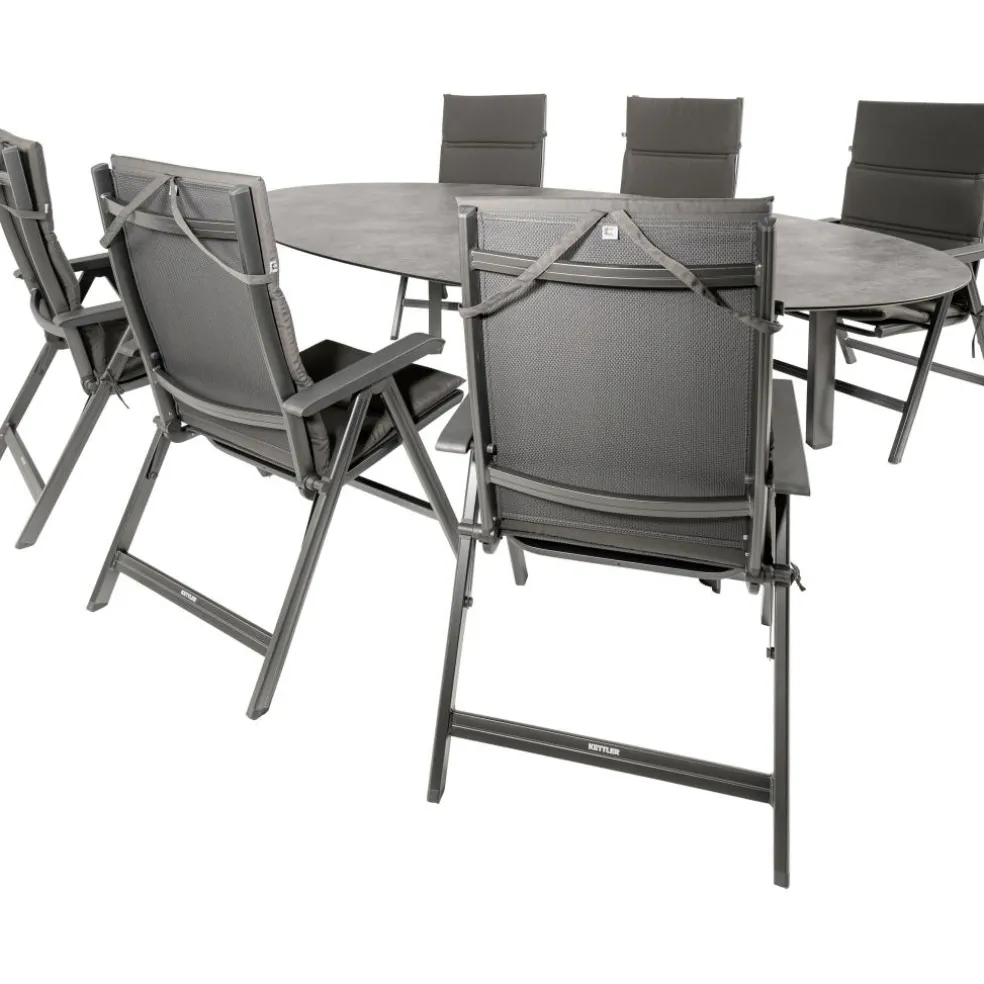 De Kettler HPL Edge 240 Basic Plus tuinset biedt de perfecte combinatie van stijl en functionaliteit voor uw buitenruimte. Deze set bestaat uit een ovale dining tuintafel en zes verstelbare Basic Plus tuinstoelen. De Kettler HPL Edge tuintafel is vervaardigd van duurzaam High Pressure Laminate, wat zorgt voor een onderhoudsvriendelijk, weer- en temperatuurbestendig tafelblad. Het aluminium onderstel met poedercoating en driehoekige tafelpoten, inclusief verstelbare tafelpoot, garandeert stabiliteit en duurzaamheid. De Basic Plus tuinstoelen, uitgevoerd in antraciet, hebben een verstelbare rugleuning en kunnen een maximale belasting van 120 kilogram aan. Deze opklapbare stoelen zijn bestand tegen diverse weersinvloeden dankzij het gebruik van aluminium en textileen, en worden geleverd met comfortabele polyester kussens voor extra zitcomfort.
