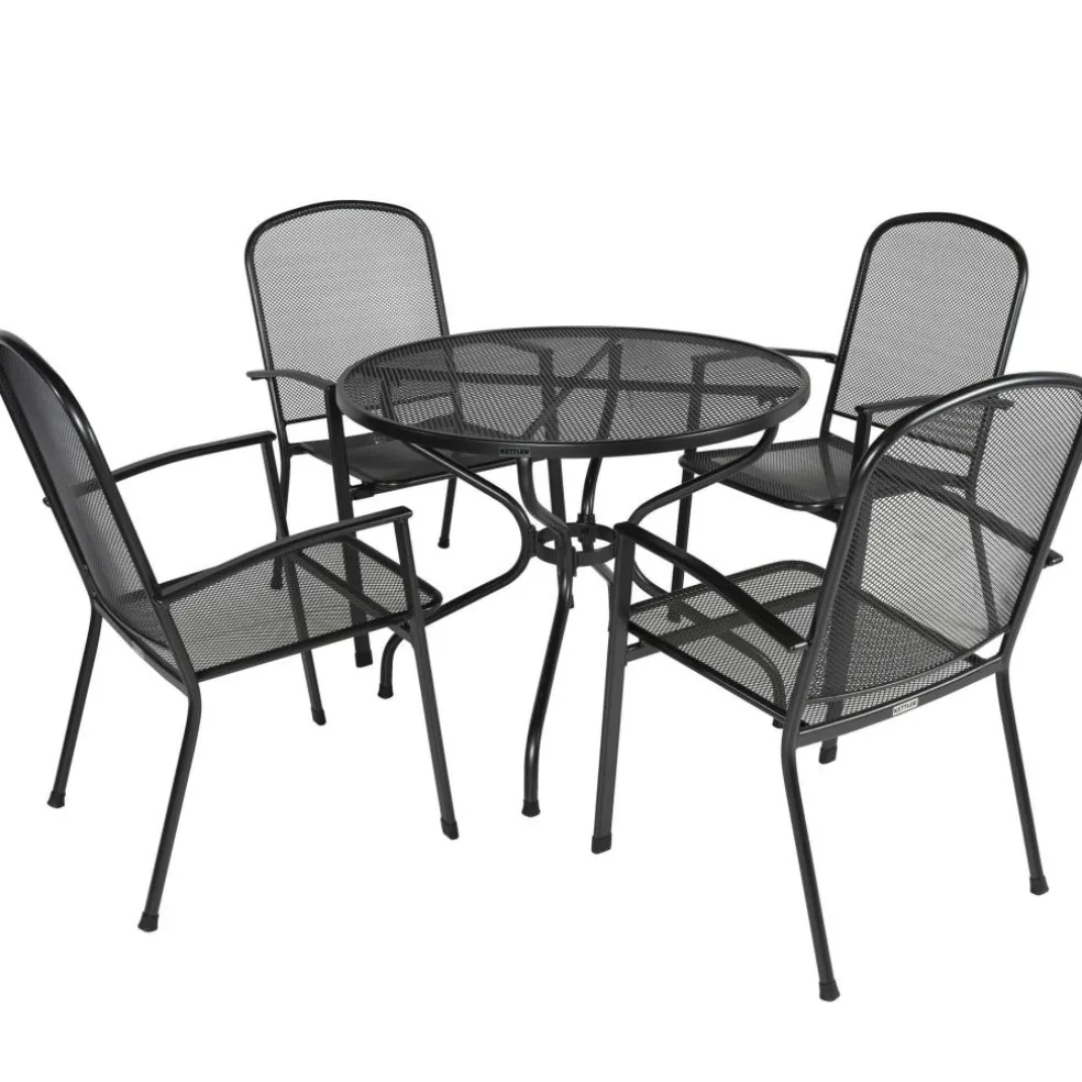 De Kettler Strek 90 Vigo tuinset in de kleur antraciet is een duurzame, moderne set en kan het hele jaar buiten blijven staan. De vormgeving is tijdloos en kan met verschillende tuinstijlen gecombineerd worden. De set bestaat uit vier stapelbare stoelen en een ronde tafel, beide gemaakt van staal en strekmetaal, behandeld met een speciale Kettlotherm beschermlaag. Deze laag is weerbestendig en zorgt ervoor dat de Vigo tuinset het hele jaar buiten kan blijven staan zonder last te krijgen van roest.