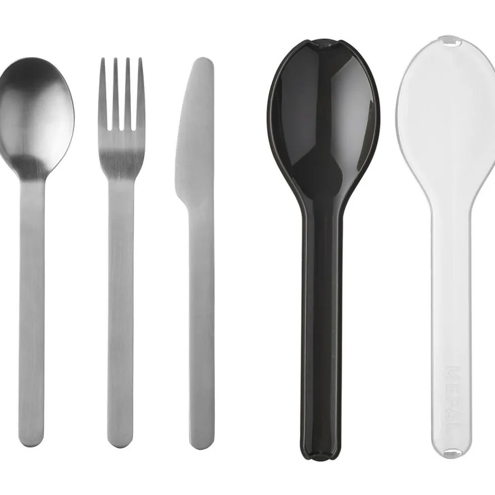 Het Mepal Ellipse bestekset bestaat uit een vork, mes en lepel en deze worden schoon gehouden door de kunststof houder. Dit bestek mag in de vaatwasser en is handig om mee te nemen overal naartoe.