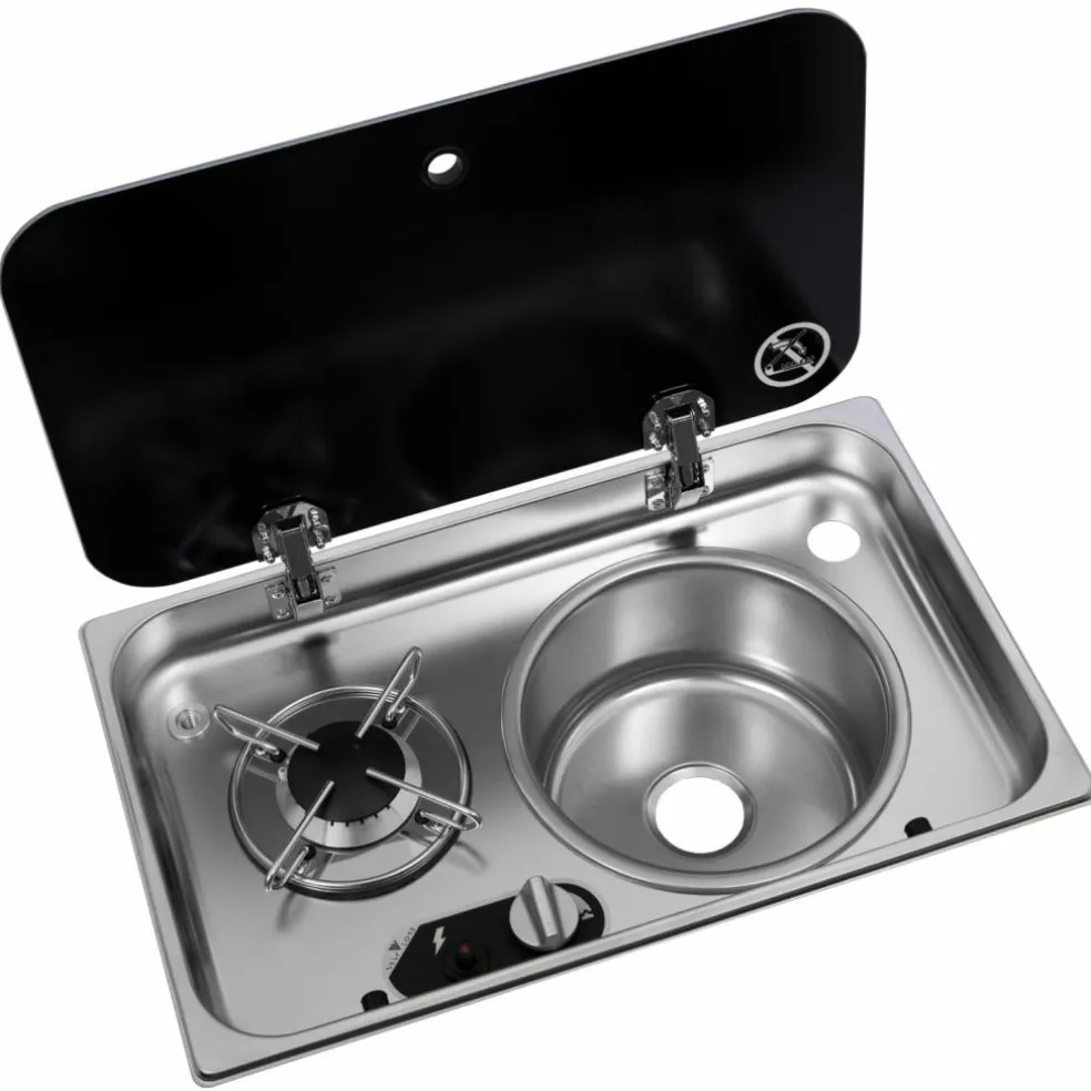 De Navy Load NL.24000 Kook-spoelcombinatie rechts is voorzien van 1 brander en een geïntegreerde spoelbak, compleet met een glazen deksel. Deze combinatie is voorzien van een piëzo-ontsteking, maar wordt geleverd zonder waterkraan en afvoer.