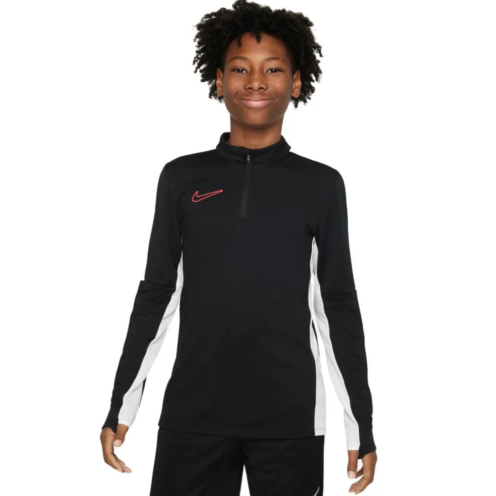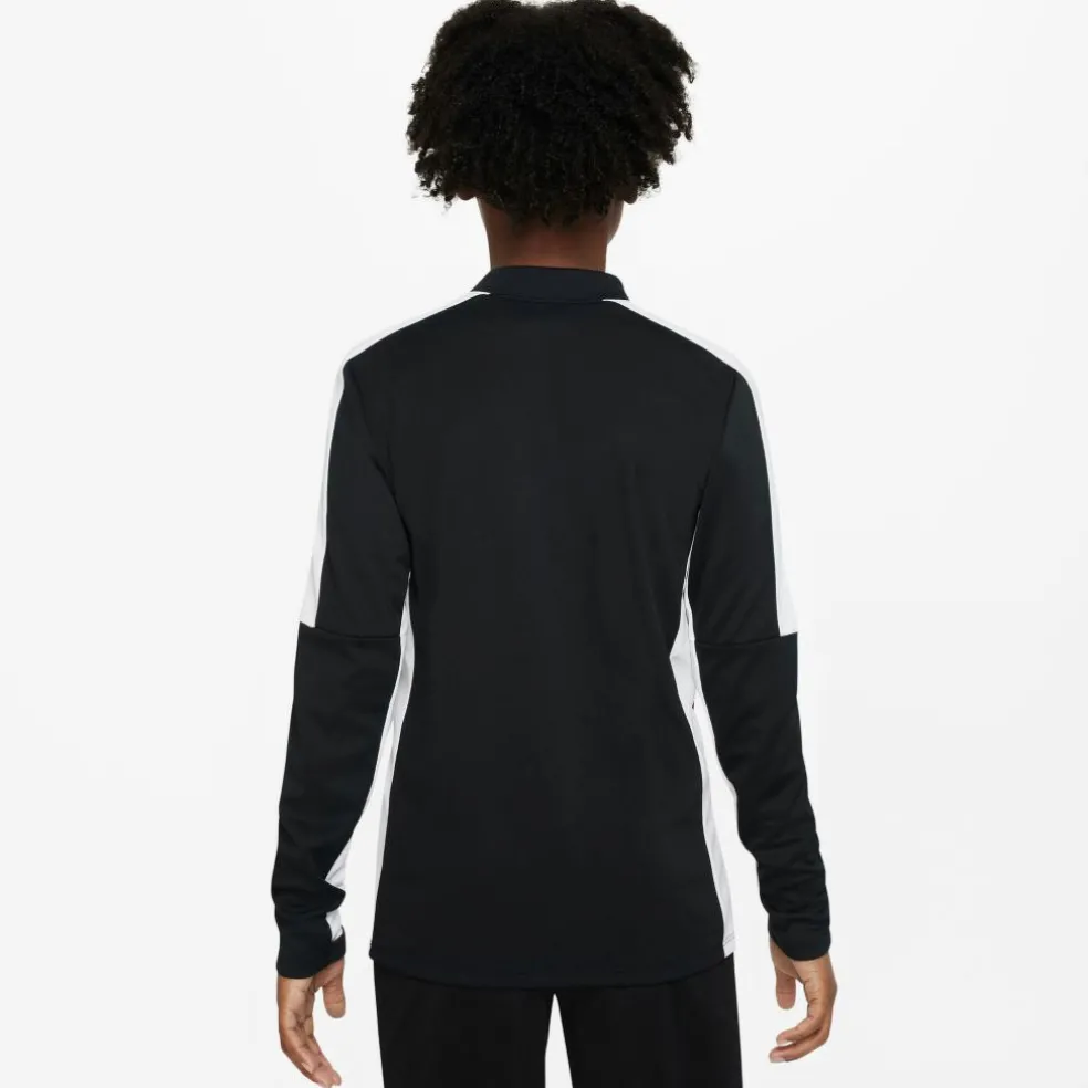 Het Nike Dri-FIT Academy 23 trainingsshirt voor kinderen heeft een strak design en het model zit strak langs het lichaam. De mouwen zijn voorzien van duimgaten en er is een rits op de borst aanwezig.