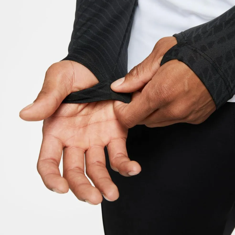 Het Nike Dri-FIT Strike trainingsshirt voor heren heeft een strakke pasvorm die het lichaam goed volgt. De stof voelt aangenaam op de huid en deze droogt snel. De trui is ideaal voor frisse ochtenden om u warm te houden tijdens de training. De trui is heeft duimgaten zodat de mouwen niet omhoog kruipen.