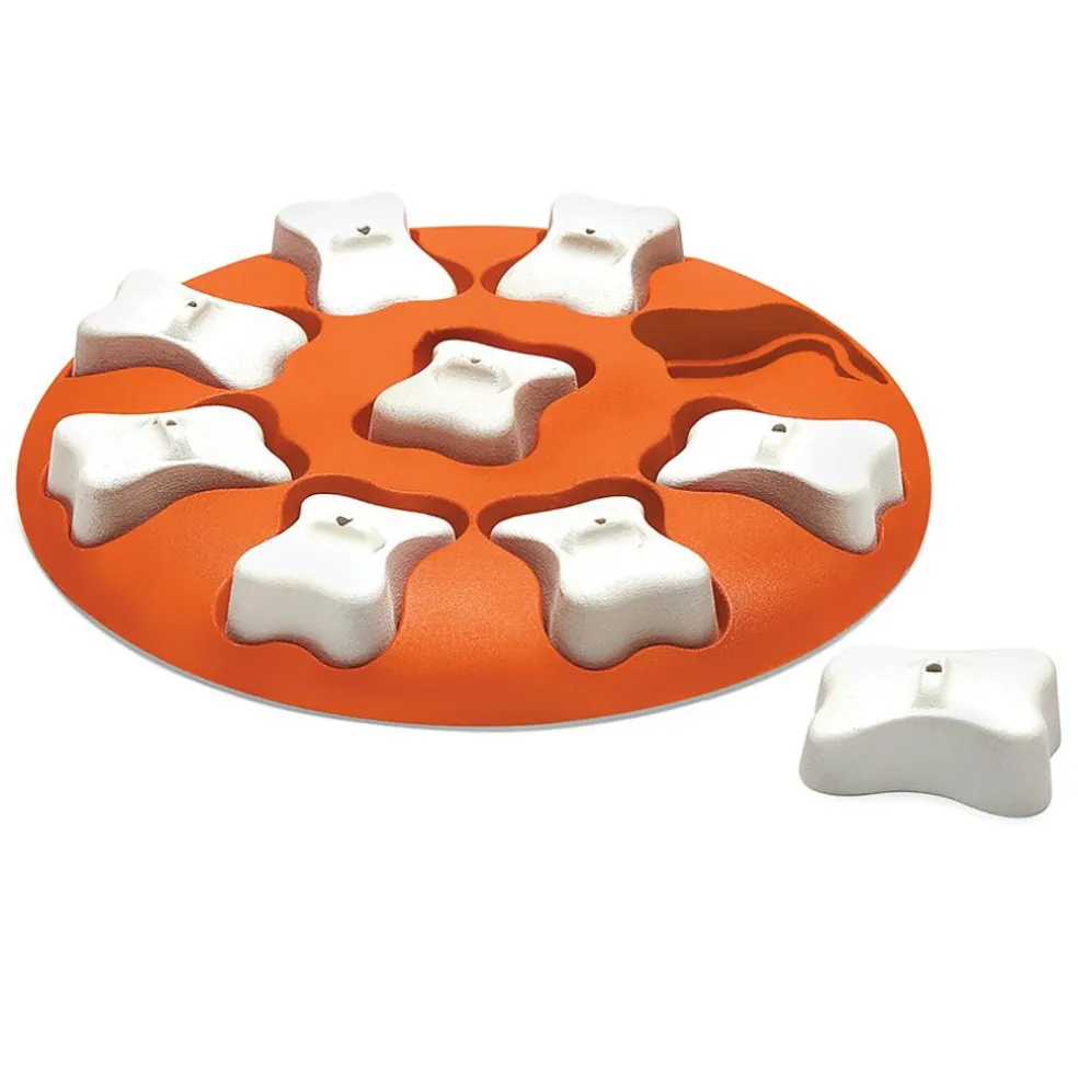 De Nina Ottosson Dog Smart is een makkelijk snack-zoekend hondenspel (moeilijkheidsgraad 1). Bij dit Nina Ottosson hondenspeelgoed worden snacks in de bakjes geplaatst en bedekt met de botjes. Hoe meer bakjes dicht zijn, hoe groter de uitdaging voor de hond!