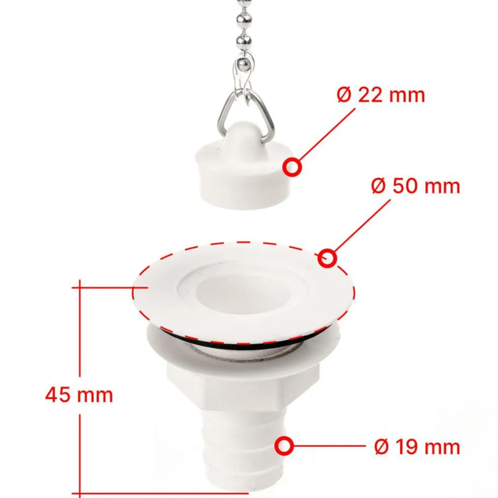 De Reich rechte afvoerplug heeft een slangaansluiting met een diameter van 19 mm. De diameter van de buitenrand van dit model is 49 mm. De afvoerplug heeft een 3/4” schroefdraad. De plug is voorzien van een stop.