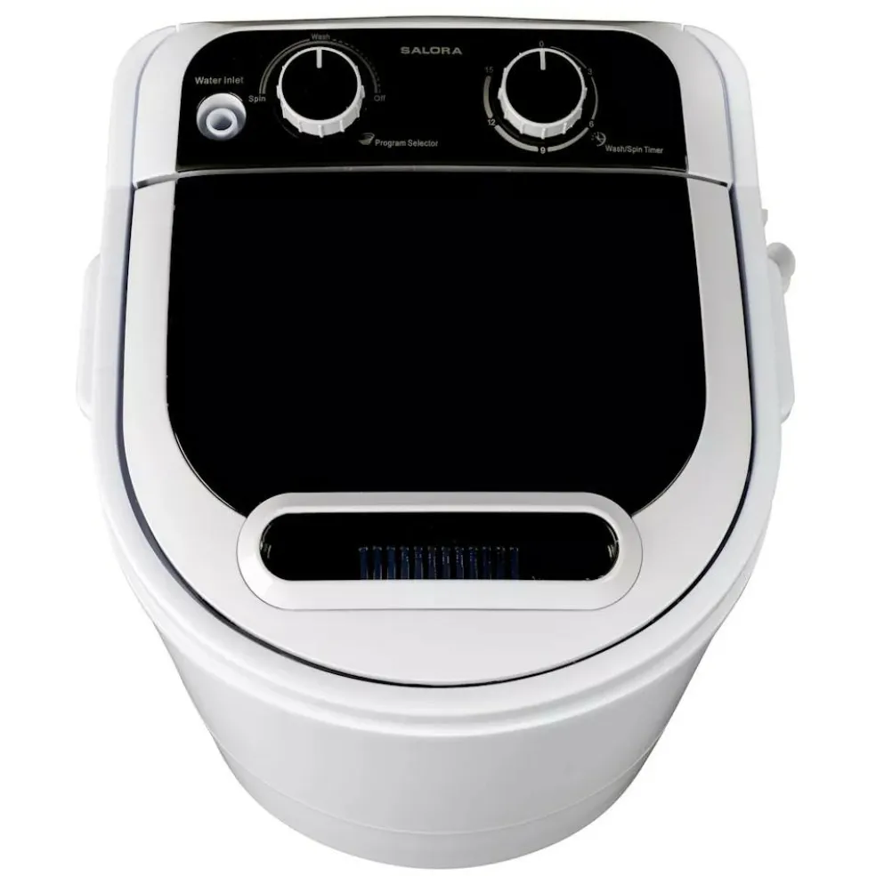 De Salora WMR3350 Mini wasmachine is van een praktisch formaat, waardoor deze goed van pas komt op de camping of op een studentenkamer. Deze Salora wasmachine heeft een maximale belading van 3 kg en een vulgewicht voor de centrifuge van 2 kg. Daarnaast is de wasmachine voorzien van een timer van 15 minuten en heeft deze een RPM van 350. Bovendien kunnen de afvoerslang en het snoer door middel van handige haakjes opgeborgen worden.