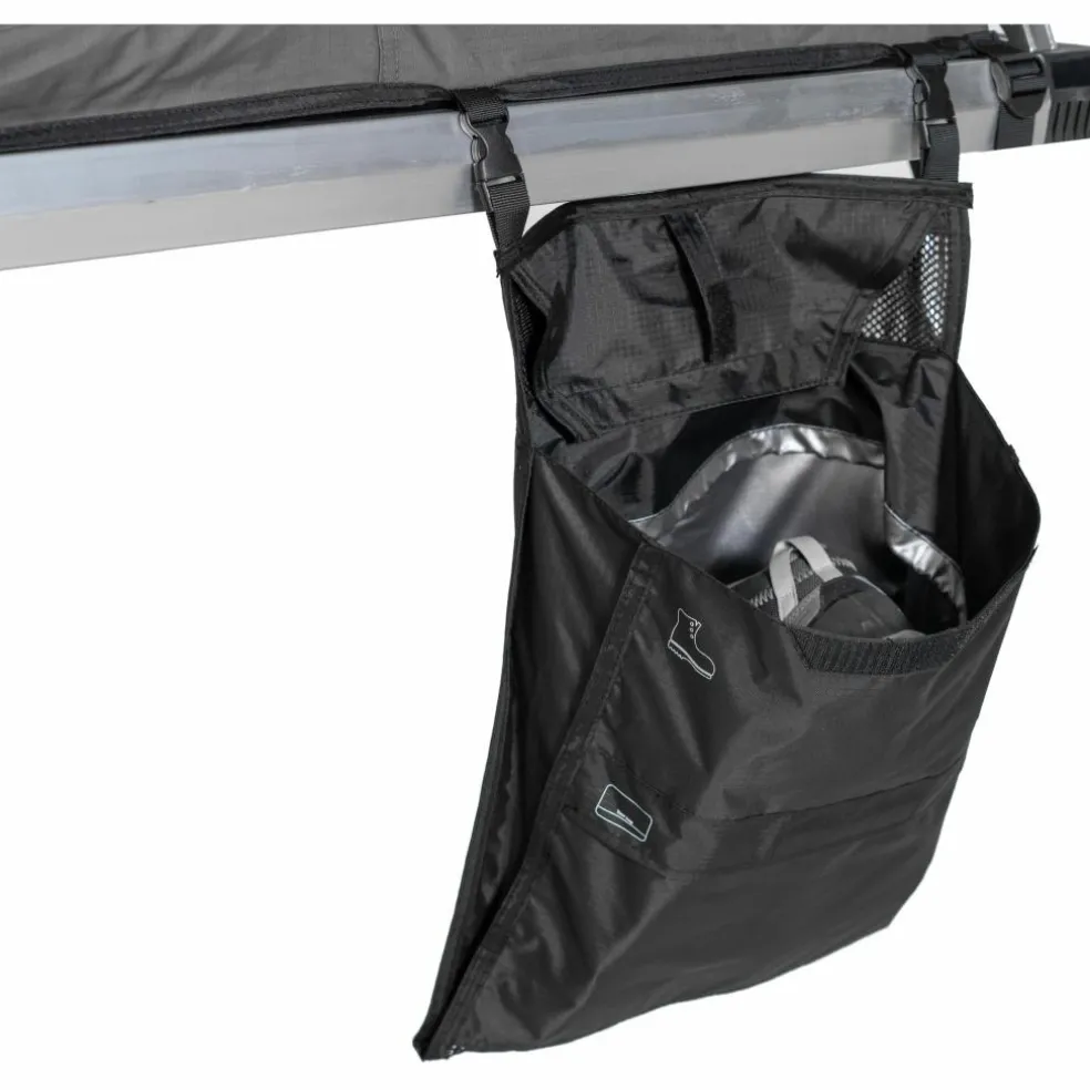 - Opberggemak: interne opbergvakken voor kleine spullen, twee externe schoenenzakken om modder buiten te houden.