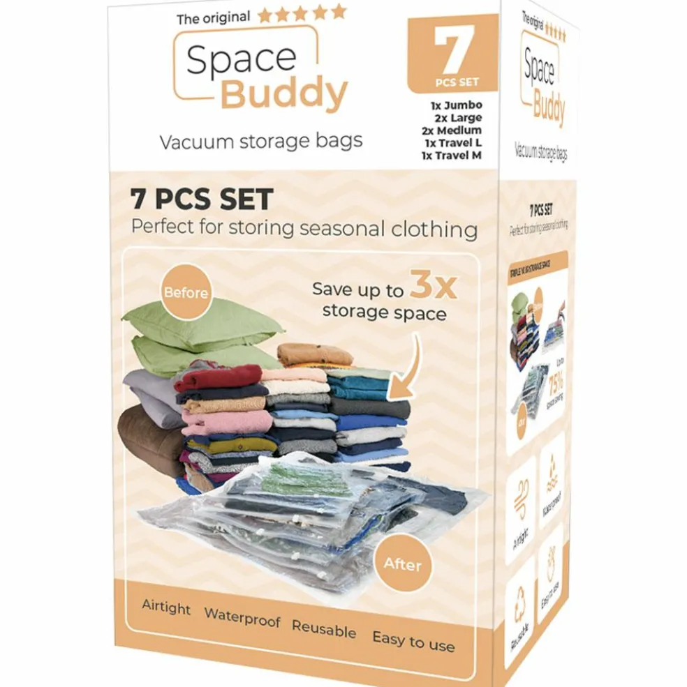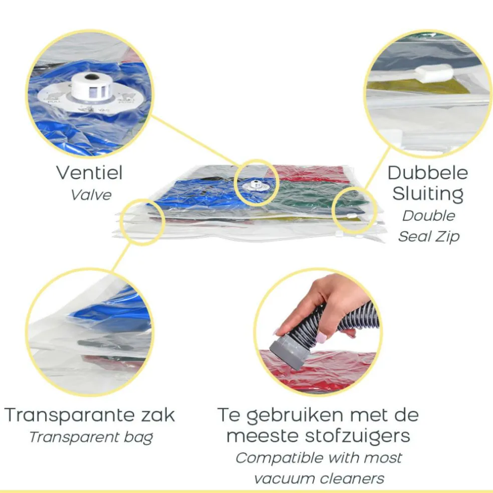 Met de Vacuüm opbergzakken van Space Buddy bergt u gemakkelijk diverse items op zoals beddengoed, seizoenskleding, kussens etc. Met deze zakken creëert u op een handige manier extra ruimte in uw kast. Bovendien worden uw spullen beschermd tegen stof, verkleuring, schimmel, vocht en insecten.