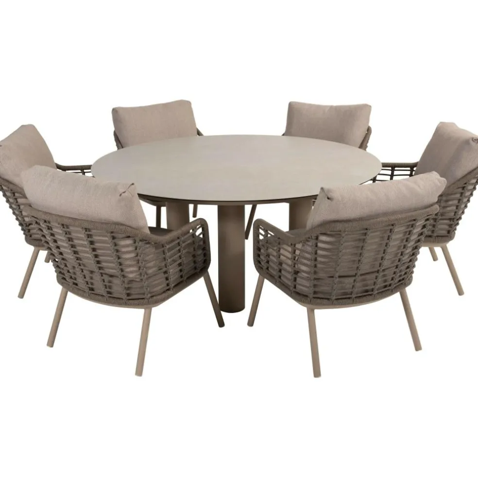 De Taste by 4 Seasons Donato tuinset met Puglia stoelen biedt een goede balans tussen stijl, comfort en duurzaamheid. De zes Puglia tuinstoelen zijn vervaardigd uit hoogwaardige outdoormaterialen, waardoor ze langdurig bestand zijn tegen diverse weersomstandigheden. Het aluminium frame is voorzien van een latte-kleurige poedercoating. Het met de hand gevlochten taupekleurige rope vlechtwerk zorgt voor een verfijnde afwerking. Voor optimaal zitcomfort zijn de stoelen uitgerust met extra gevulde zit- en rugkussens, bekleed met weerbestendig en zacht Olefin-textiel. De set wordt compleet gemaakt door de Donato dining tuintafel, die met zijn ronde keramisch geprinte blad en drie stevige aluminium poten met latte poedercoating een luxe uitstraling heeft.