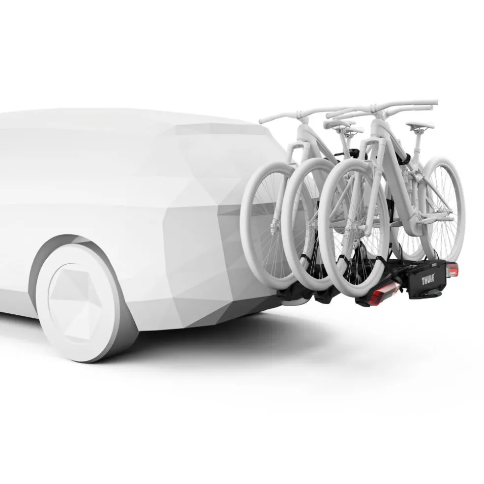 De Thule Epos 3-bike fietsendrager is een veelzijdige en robuuste oplossing voor het vervoeren van drie fietsen, inclusief zware e-bikes tot 30 kilogram per fiets. Dankzij de ruime afstand van 25 centimeter tussen de fietsen wordt het risico op contact en schade verminderd. Met de extra lange wielhouders kunnen fietsen met een lange wielbasis tot 135 centimeter eenvoudig worden vervoerd.
