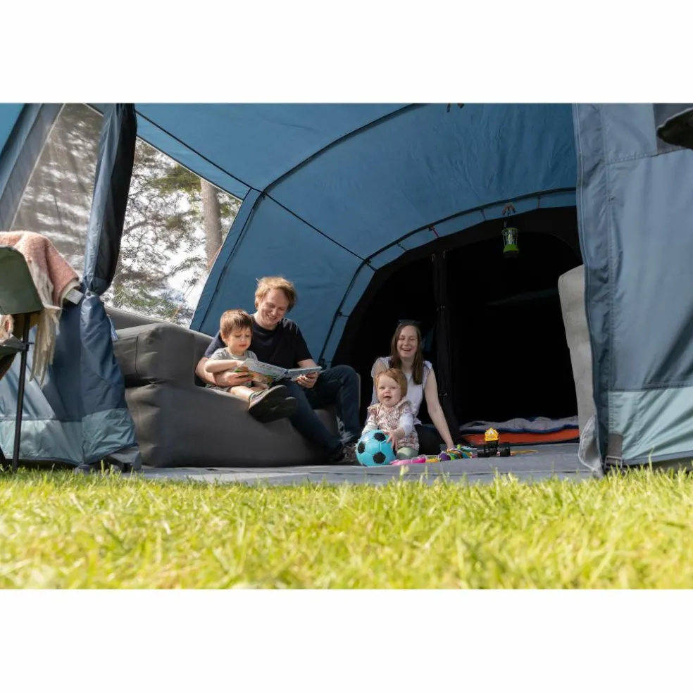 De buitentent is uitgevoerd in stevig Sentinel Fabric met Colourlok Eco-technologie. Met een waterkolom van 4.000 mm blijft de leef- en slaapruimte ook bij langdurige regenval droog, terwijl de UV-bestendigheid van het doek de levensduur ondersteunt en de blauwe kleur mooi houdt. De binnentent is gemaakt met Midnight Bedroom-technologie: het verduisterde doek laat minder licht door, zodat u en de kinderen langer doorslapen bij ochtendzon of campingverlichting. Het volledig ingenaaide PE-grondzeil sluit rondom af, waardoor tocht, vuil en insecten buiten blijven en u binnen een schoon, warm loopvlak behoudt. De glasfiber stokken geven de tunneltent een stabiel, veerkrachtig geraamte met een gunstig gewicht voor een 6-persoons familietent.