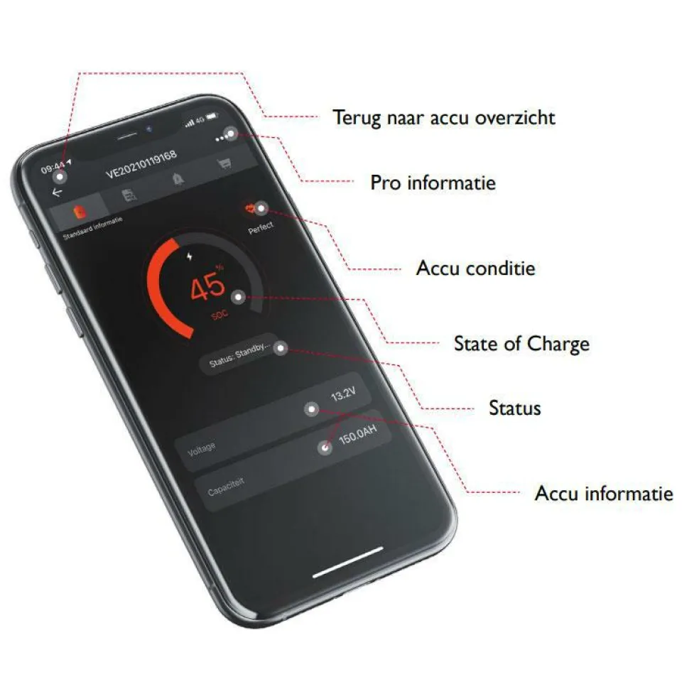 Zodra u de app heeft gedownload, kunt u via bluetooth verbinding maken met de accu. Meer uitleg hierover vindt u in de bijgeleverde handleiding.