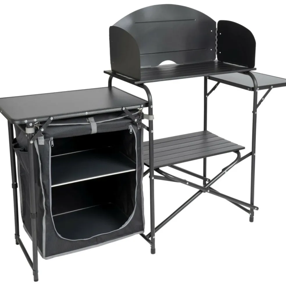 Met de Bardani Levanto camping keuken kunt u gemakkelijk uw eigen gerechten bereiden tijdens het kamperen. Deze Bardani Levanto camping keuken heeft twee schappen en kleine opbergvakjes aan de zijkant. Daarnaast is de kampeerkeuken voorzien van een inklapbaar zijtafeltje en een metalen windscherm. De kampeerkeuken is geheel in te klappen waardoor u deze makkelijk bij uw bagage kwijt kunt.
