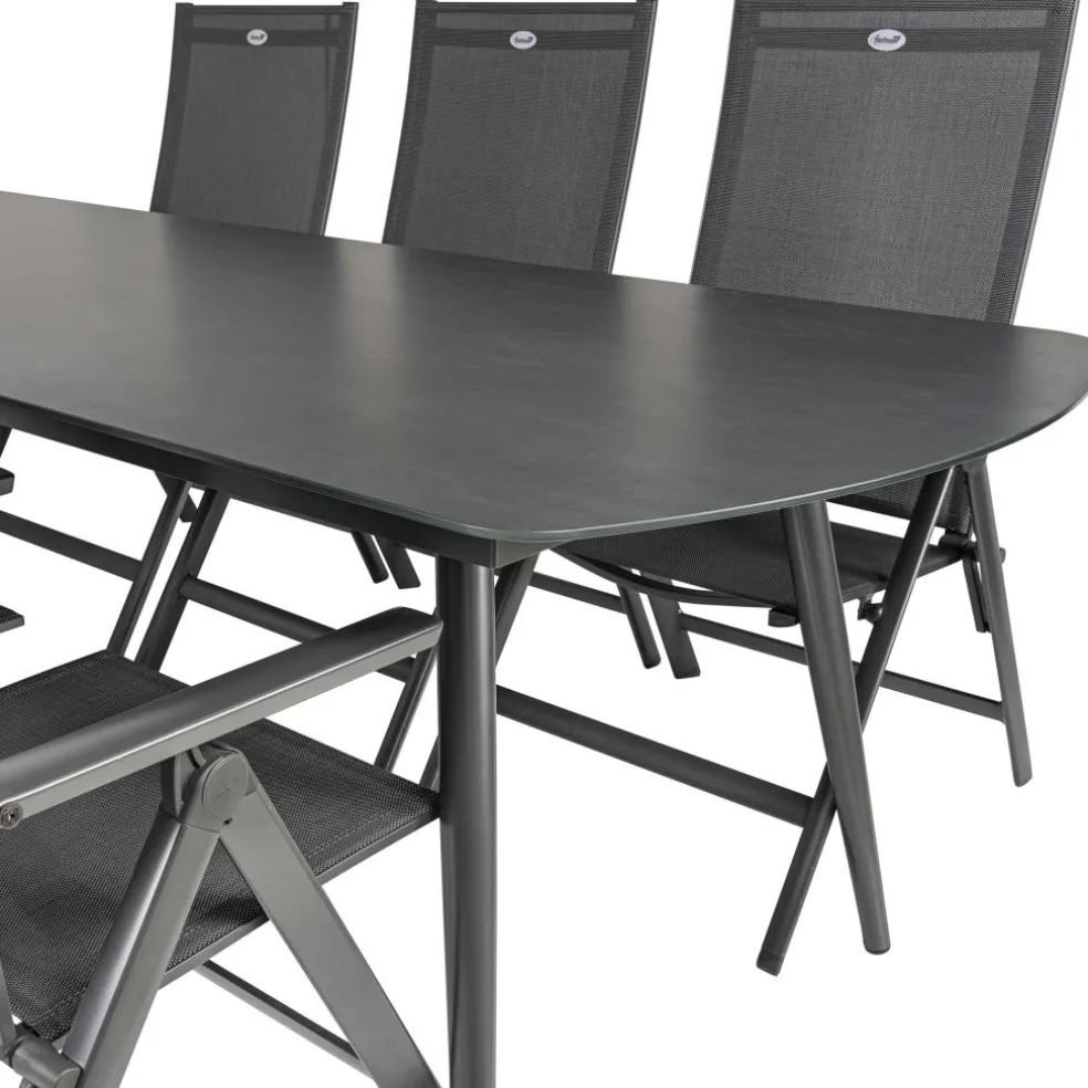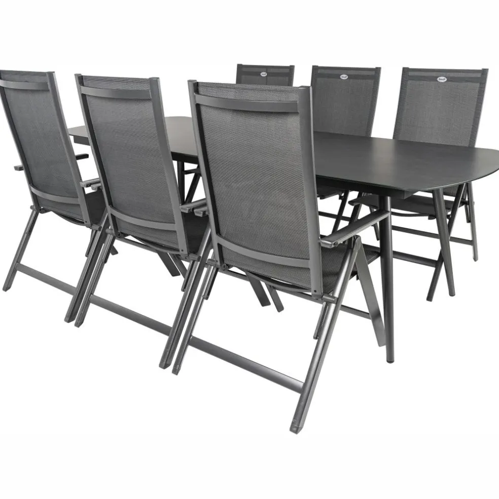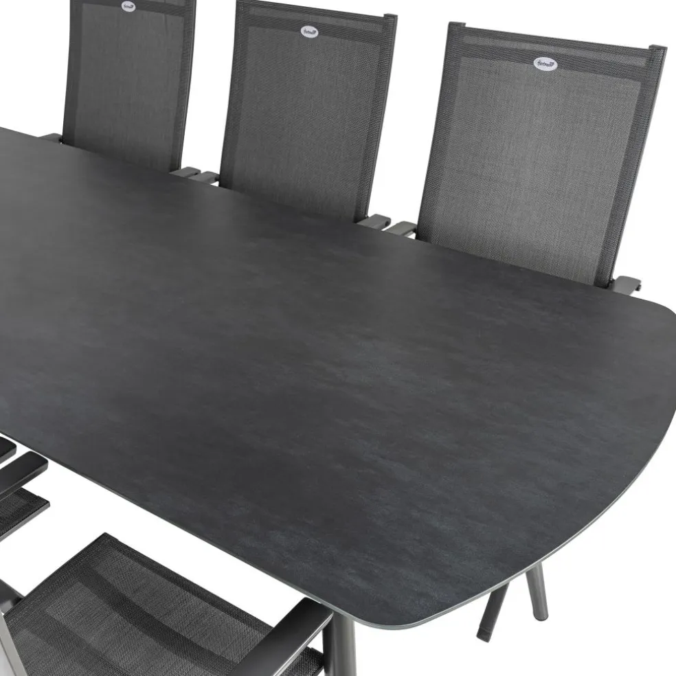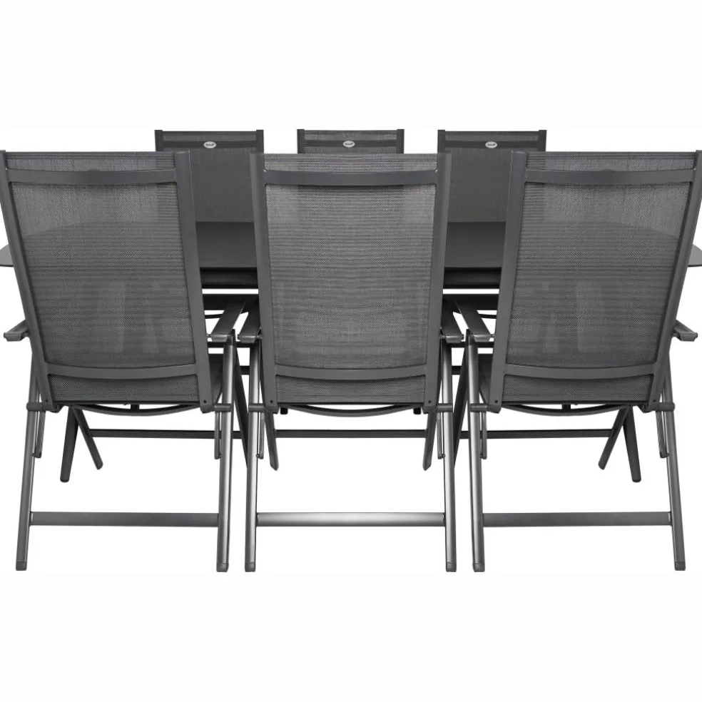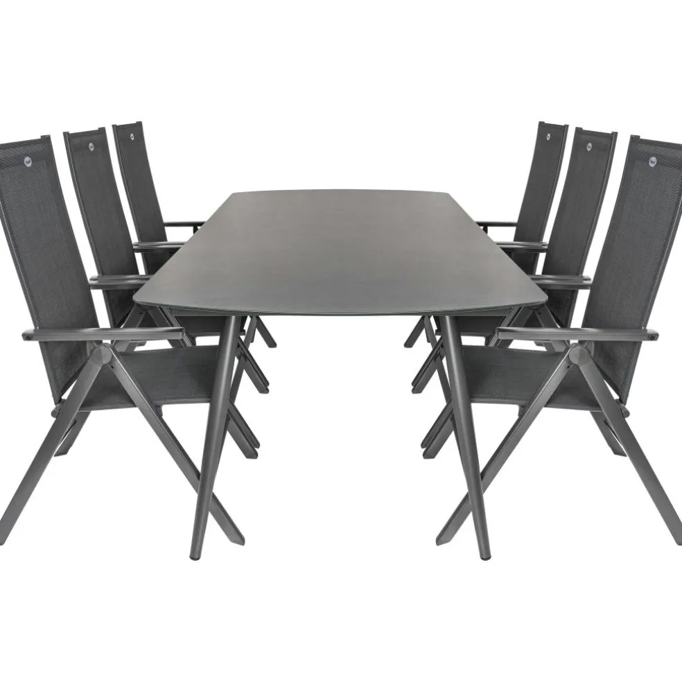 De Bardani Olivia 240 x 100 cm Aruba 6 tuinset is een stijlvolle en moderne set die bestaat uit een rechthoekige tafel en 6 verstelbare tuinstoelen. De tuinset is gemaakt van sterk aluminium, glas en textileen waardoor deze onderhoudsarm is en een lange levensduur heeft. Daarnaast zijn de stoelen eenvoudig in te klappen en te verstellen.