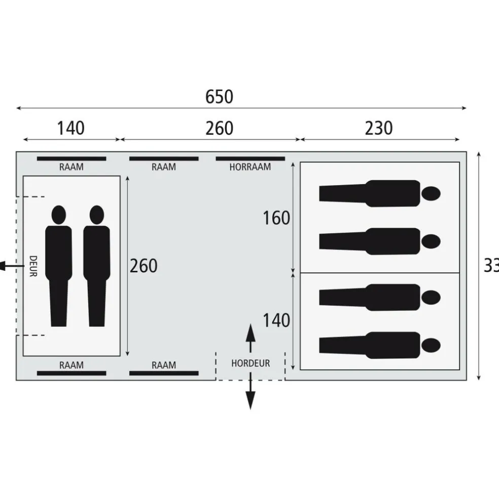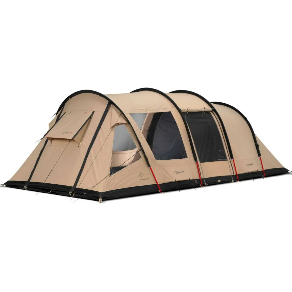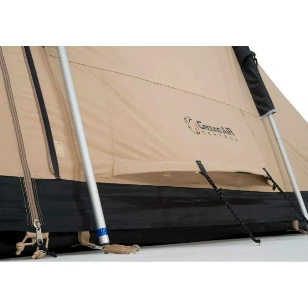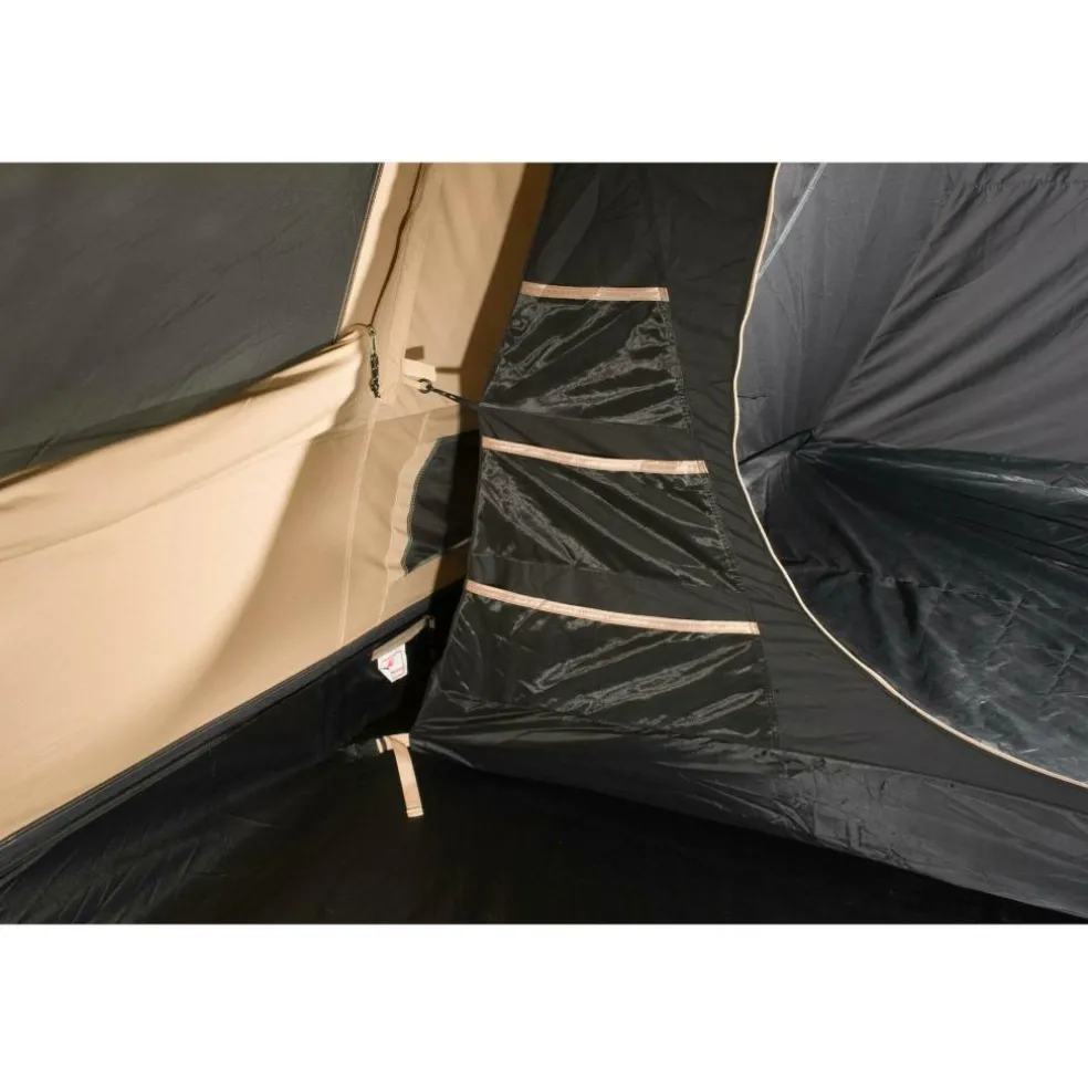 Het buitendoek bestaat uit ademend RSTC (ripstop technical cotton): sterk, stil bij wind en minder benauwd dan volledig polyester. Dat merkt u aan een rustiger binnenklimaat en minder condens. De binnentent is van ademend technisch katoen, waardoor de slaapcabines donker en koeler blijven. Met een 5.000 mm waterkolom en een vast kuipgrondzeil van Oxford polyester blijft de leefruimte droog op nat gras en houden u en uw bagage droge voeten. Het frame bestaat uit aluminium boogstokken; licht, stijf en vormvast, dus prettig bij op- en afbouw én betrouwbaar bij wind.