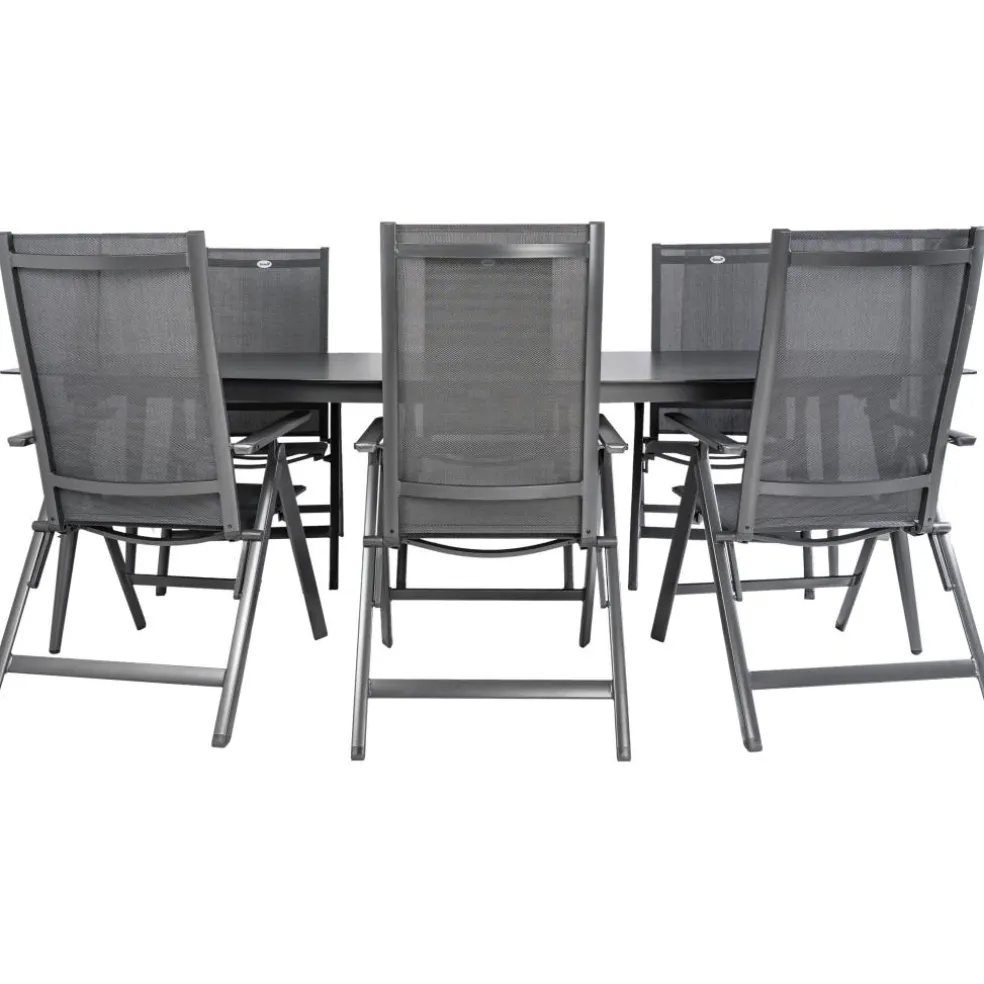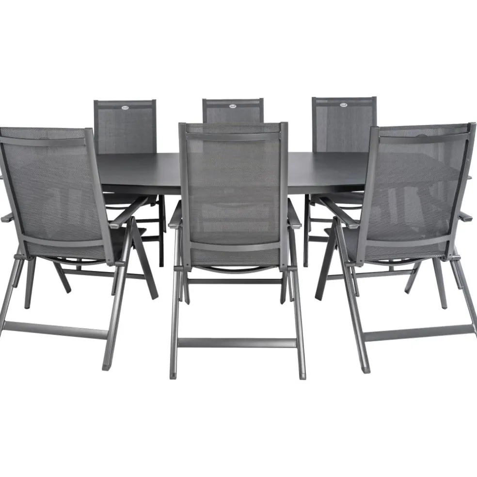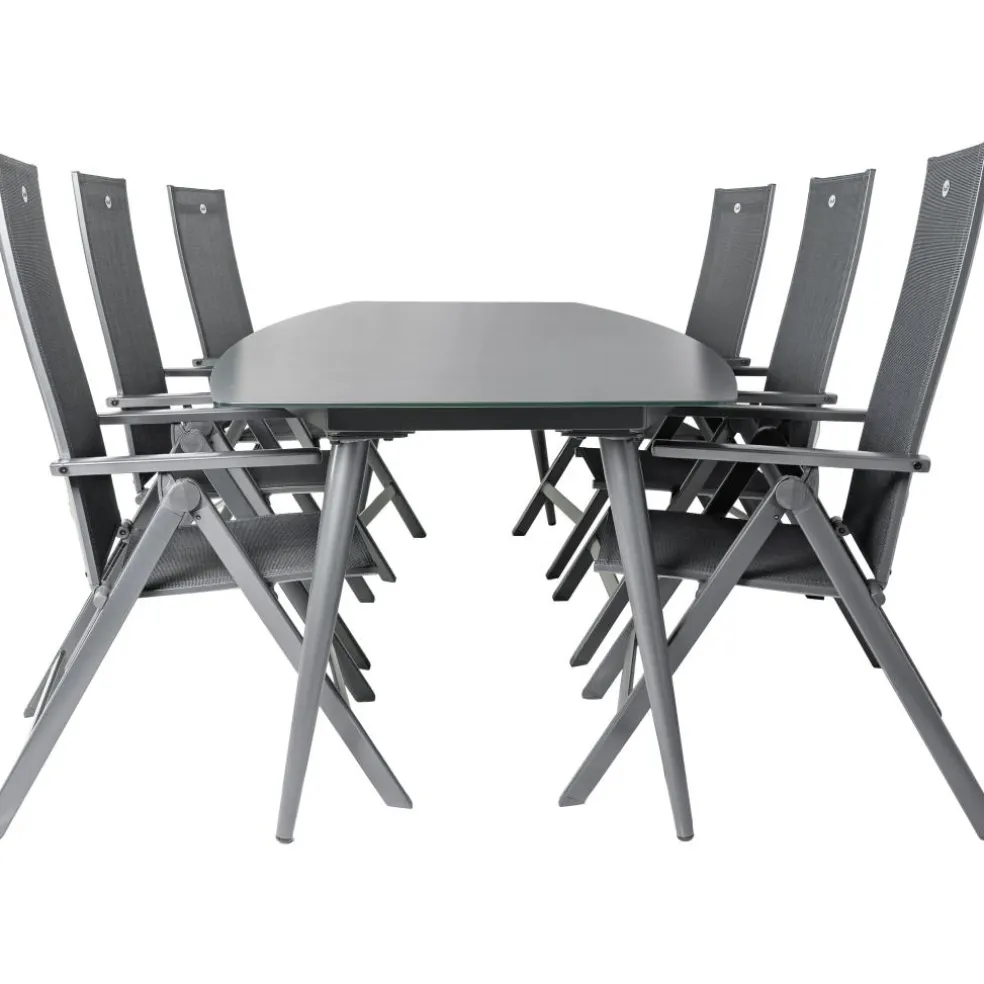 De stoelen zijn voorzien van armleuningen, waarmee de rugleuningen versteld kunnen worden voor een comfortabele zithouding. De materialen zijn bestand tegen de weersinvloeden, waardoor ze makkelijk zijn in onderhoud.