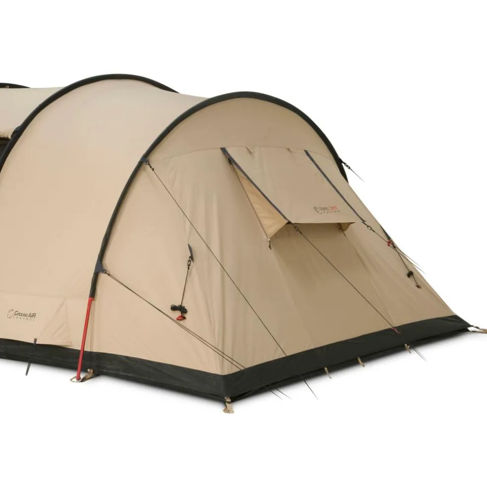De binnentent is van technisch katoen (katoen/polyester). Dat materiaal neemt vocht op en geeft het weer langzaam af, zodat u ’s nachts minder last heeft van klamme lucht. Onder uw voeten ligt een vast polyester grondzeil met een waterkolom van 5.000 mm, daarmee blijft de leefruimte ook bij langdurige regenval betrouwbaar droog. De aluminium boogstokken zorgen voor een stevige, toch relatief lichte constructie (totaal ca. 31 kg) en leveren extra stabiliteit bij wind.
