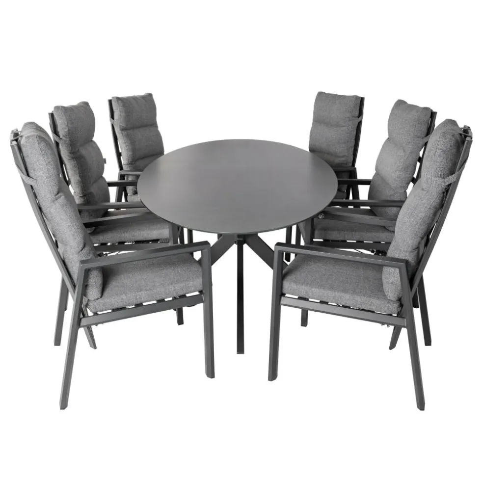 Deze Bardani Varesse 240 x 108 cm Impera 6 tuinset heeft een strak design met moderne uitstraling dankzij de prachtige antraciet kleur. Deze tuinset bestaat uit een grote ovaalvorm tafel met zes stoelen die verstelbaar zijn naar wens. De zachte zit- en rugkussens bieden comfort terwijl het makkelijk te onderhouden materiaal ervoor zorgt dat u vele zomers kunt genieten van deze tuinset van Bardani.