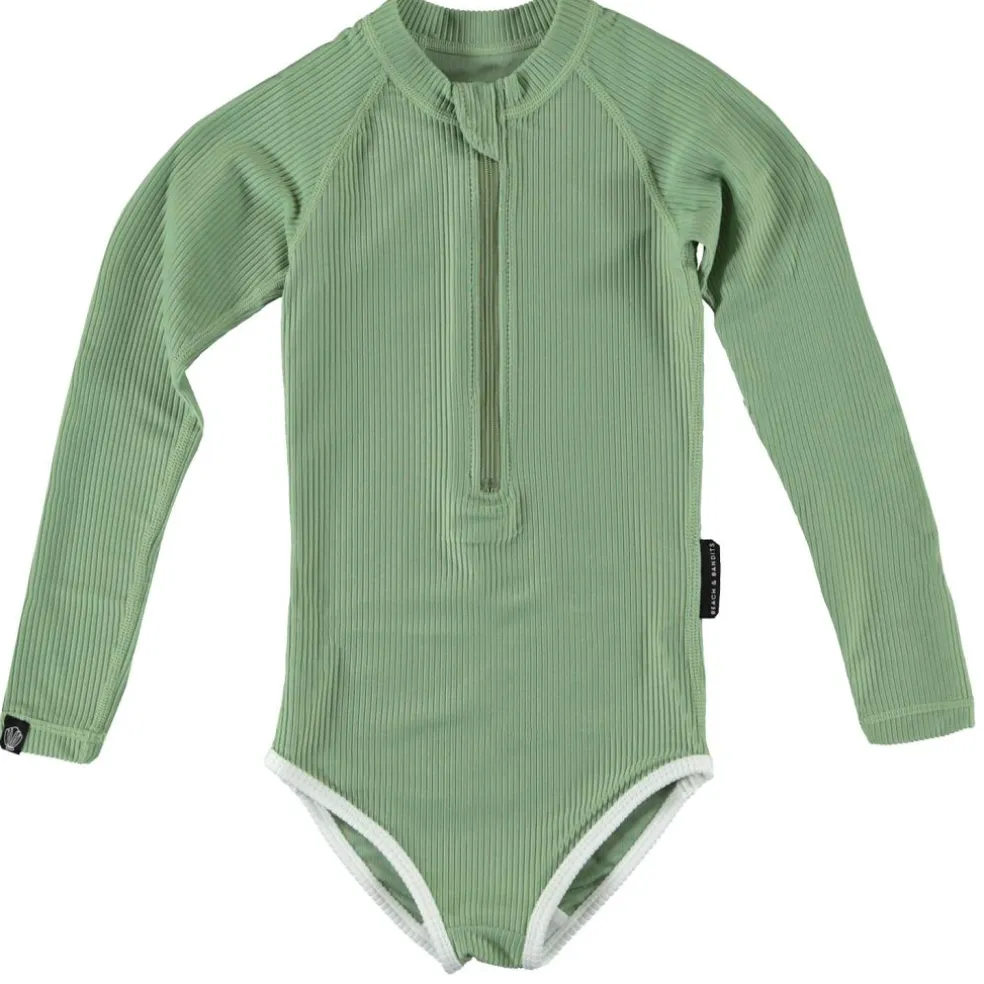 Het Beach & Bandits Basil Ribbed badpak voor kinderen heeft een frisse kleur en is perfect voor tijdens zonnige dagen. Dit badpak biedt bescherming tot 97,5% tegen UVA en UVB-straling. Het badpak heeft een rits aan de voorzijde en de stof is ademend. De kleur en vorm van het badpak gaan langdurig mee.