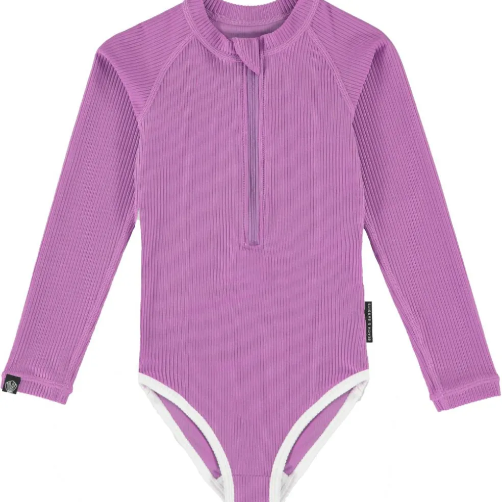 Het Beach & Bandits Orchid Ribbed badpak voorkomt huidirritatie bij uw kind, dankzij de speciale stiksels. Tevens wordt de huid beschermd tegen schadelijke uv-straling en zal de huid in de nek niet bekneld raken in de rits, dankzij de kinbescherming. Het materiaal zorgt voor een ademend en comfortabel gevoel, waardoor kinderen zich fijn voelen in dit badpak.