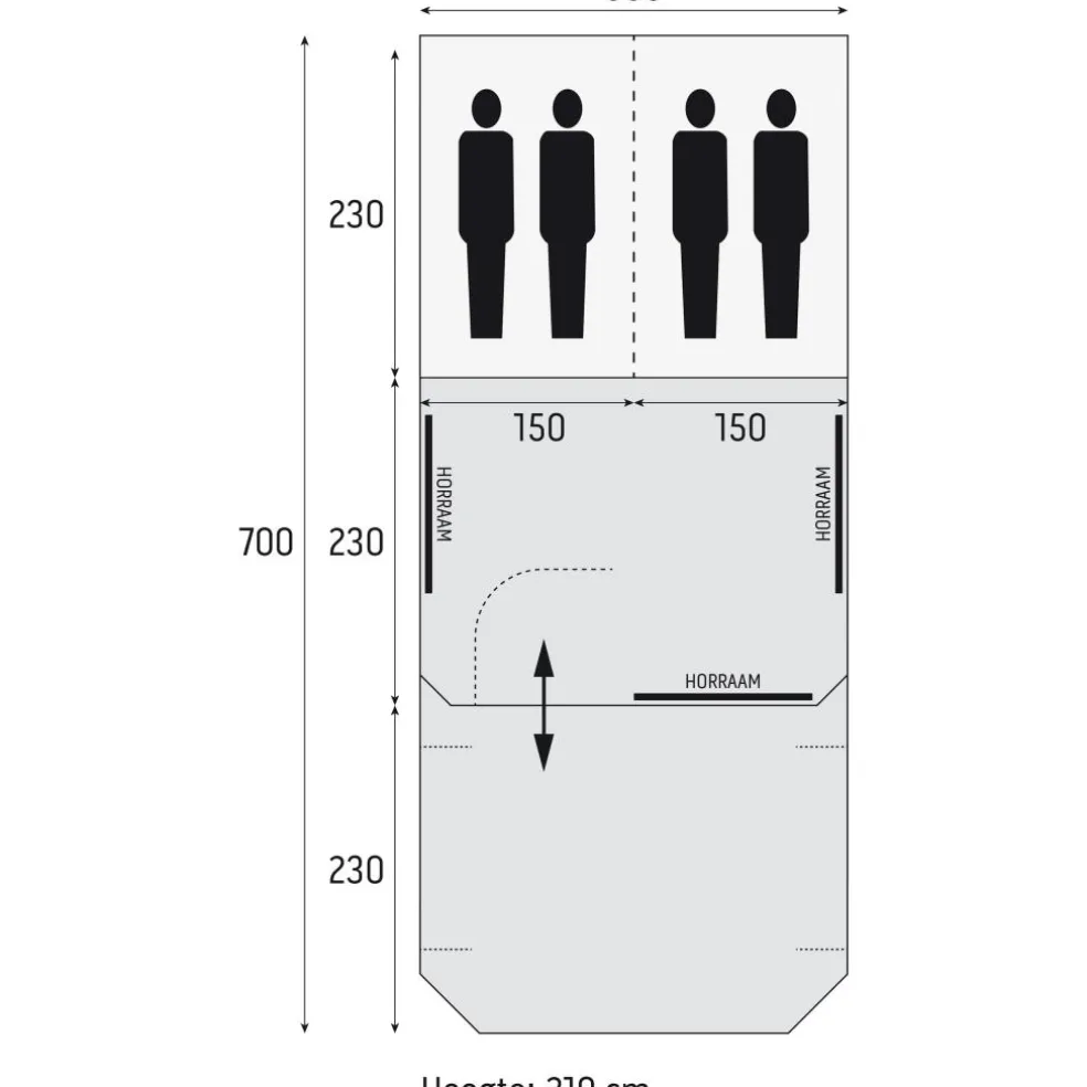 De indeling is ruim en logisch voor een gezin of twee stellen. Met twee slaapcabines van 230 x 150 cm slaapt u met maximaal vier personen op volwaardige lengtes. De slaapcabines zijn van elkaar te scheiden met een oprolbare scheidingswand, zodat u privacy heeft of juist één grote slaapkamer maakt. Met een leefruimte van 230 x 300 cm heeft u binnen plek voor tafel en kasten, terwijl de luifel van 230 x 300 cm een beschutte buitenplek biedt voor koken of loungen. Met een totale maat van 700 x 300 cm staat de tent overzichtelijk op de plek en blijft er ruimte over op de kampeerplaats. De grote ramen met traploze ritsverduistering geven veel daglicht en zicht en met het inritsbare kuipgrondzeil sluit u de leefruimte tochtvrij af.
