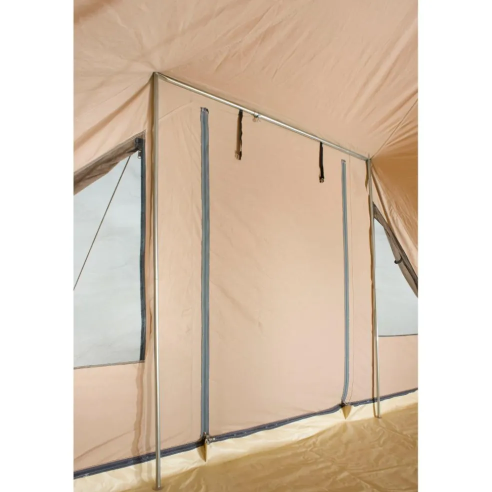 De Cabanon Nevada is vervaardigd uit hoogwaardig katoendoek, dat bekendstaat om zijn uitstekende ademend vermogen en natuurlijke bescherming tegen weersinvloeden. Het grondzeil van bisonyl is inritsbaar en zorgt voor optimale bescherming tegen vocht en vuil. Het stalen frame biedt maximale stabiliteit, zelfs bij harde wind, terwijl de zware YKK-ritsen garant staan voor langdurig gebruik. Scheerlijnen en haringen worden standaard meegeleverd, zodat u direct kunt opzetten.