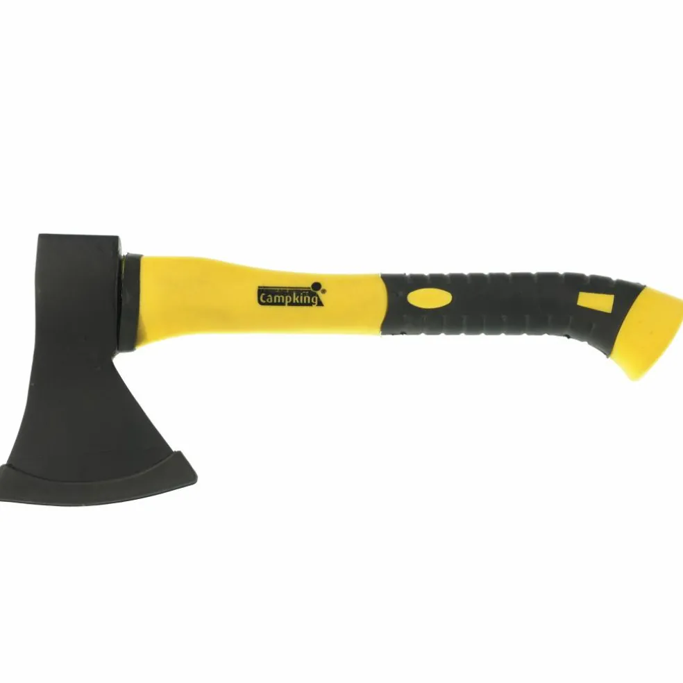 Campking kampeerbijl heeft een kunststof hendel met een rubberen grip. De lemmet heeft een beschermkap om de scherpe rand te beschermen.