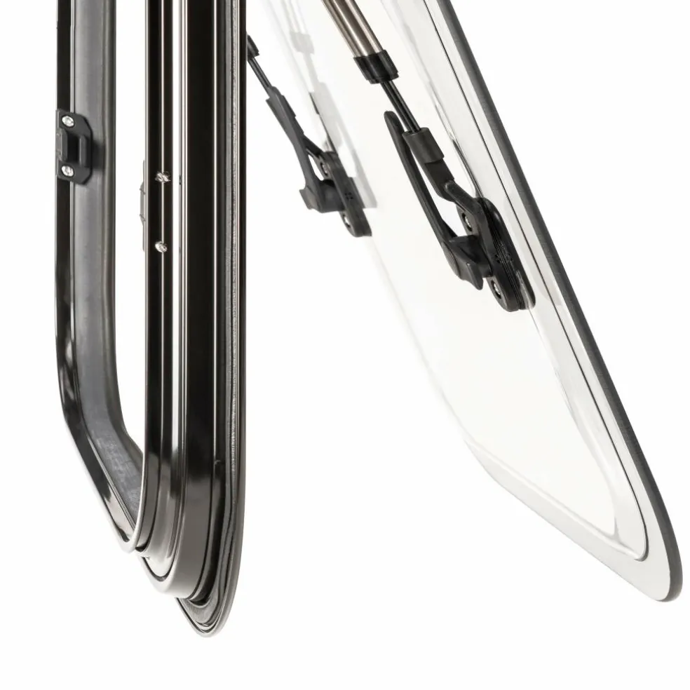 Het DWS Camping Klapraam transparant is gemaakt van dubbel acrylglas en heeft een frame van stevig gepoedercoat aluminium. Dit raam bestaat uit een buitenframe en een binnenkader die met schroeven aan elkaar zijn bevestigd. Het binnenframe is voorzien van een hor en verduisteringsgordijn. Hierdoor kunt u eenvoudig de lichtinval regelen en insecten buitenhouden. Dankzij de telescopische armen kunt u het raam op verschillende standen openzetten. De veiligheidsgrendel zorgt ervoor dat het raam niet van buitenaf open gezet kan worden. Voor montage kan het meeegleverde inbouwframe als sjabloon gebruikt worden.