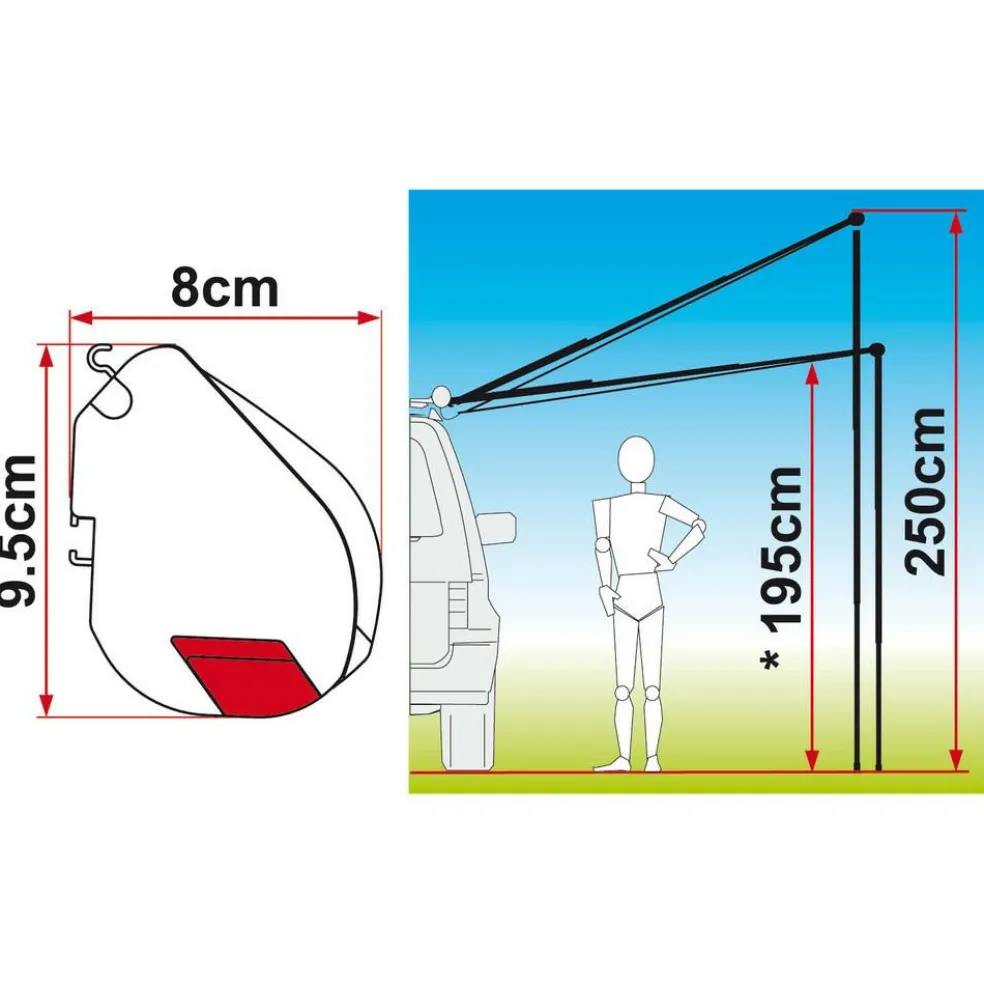 De luifel is licht in gewicht en eenvoudig op te zetten. Met behulp van de telescopische spanarmen kan de luifel strak worden opgezet. Deze luifel is te monteren op de wand, het dak of op de imperiaal. De montage adapters zijn los verkrijgbaar. Deze luifel zorgt voor een grote overdekte buitenruimte. De cassetteluifel is geschikt voor een caravan, minivan of auto.
