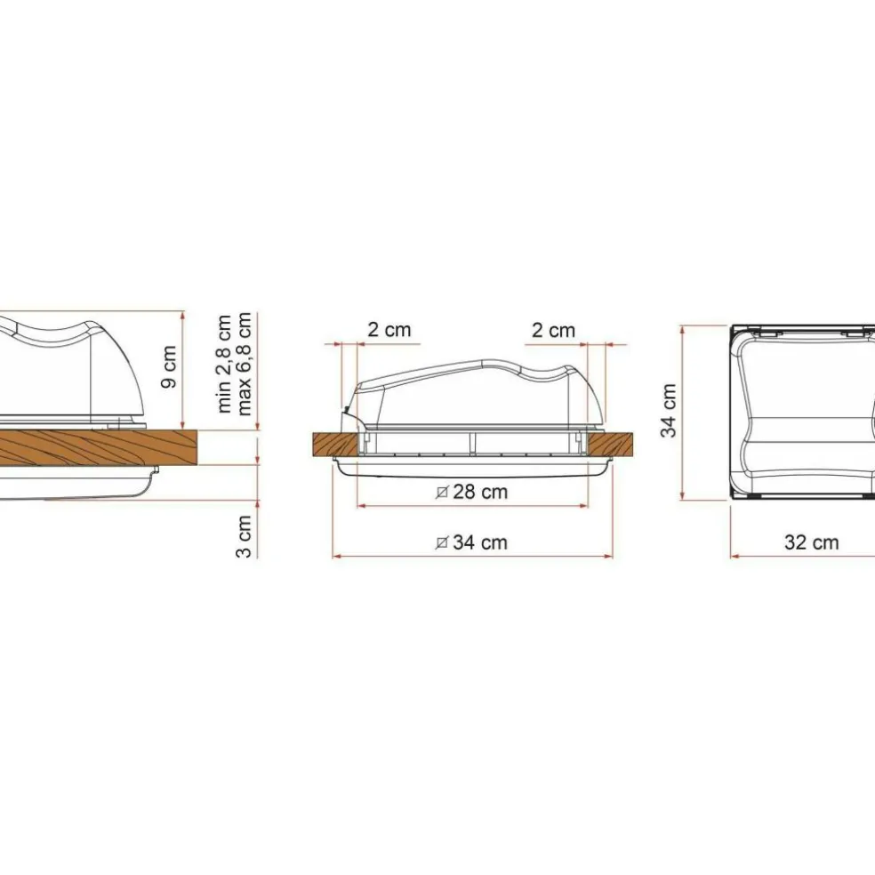 Het Fiamma Vent 28 F dakluik heeft een afmeting van 28 x 28 centimeter met een gewicht van 1,8 kilogram. De buitenafmeting van dit Fiamma dakluik is 32 x 34 centimeter en de inwendige afmeting is 31 x 34 centimeter. Voor het installeren van het dakluik heeft u een minimale dakdikte van 2,8 centimeter en een maximale dakdikte van 5 centimeter nodig.
