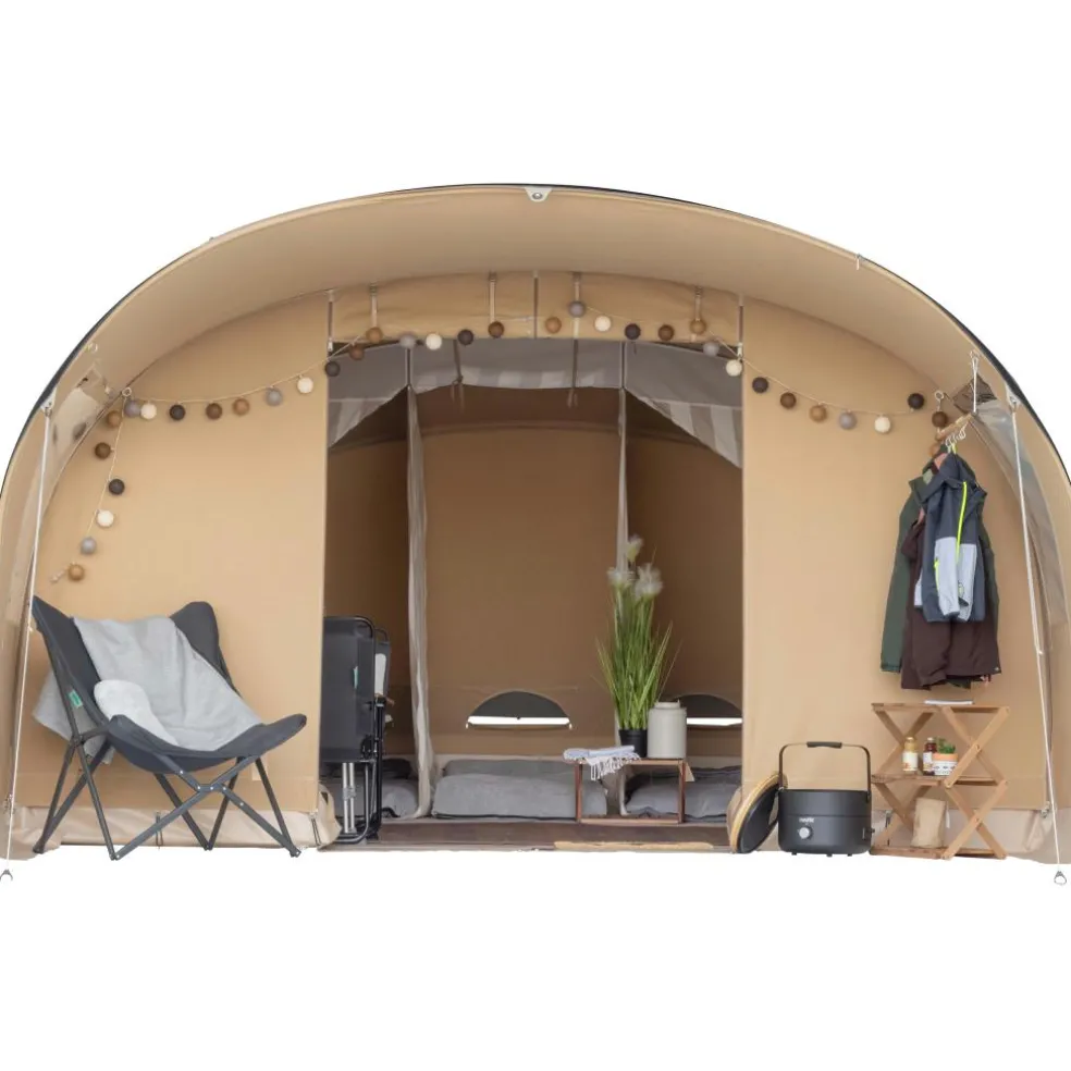 Deze tunneltent is ontworpen voor praktisch gebruik, van schaduwplek tot efficiënte ventilatie.