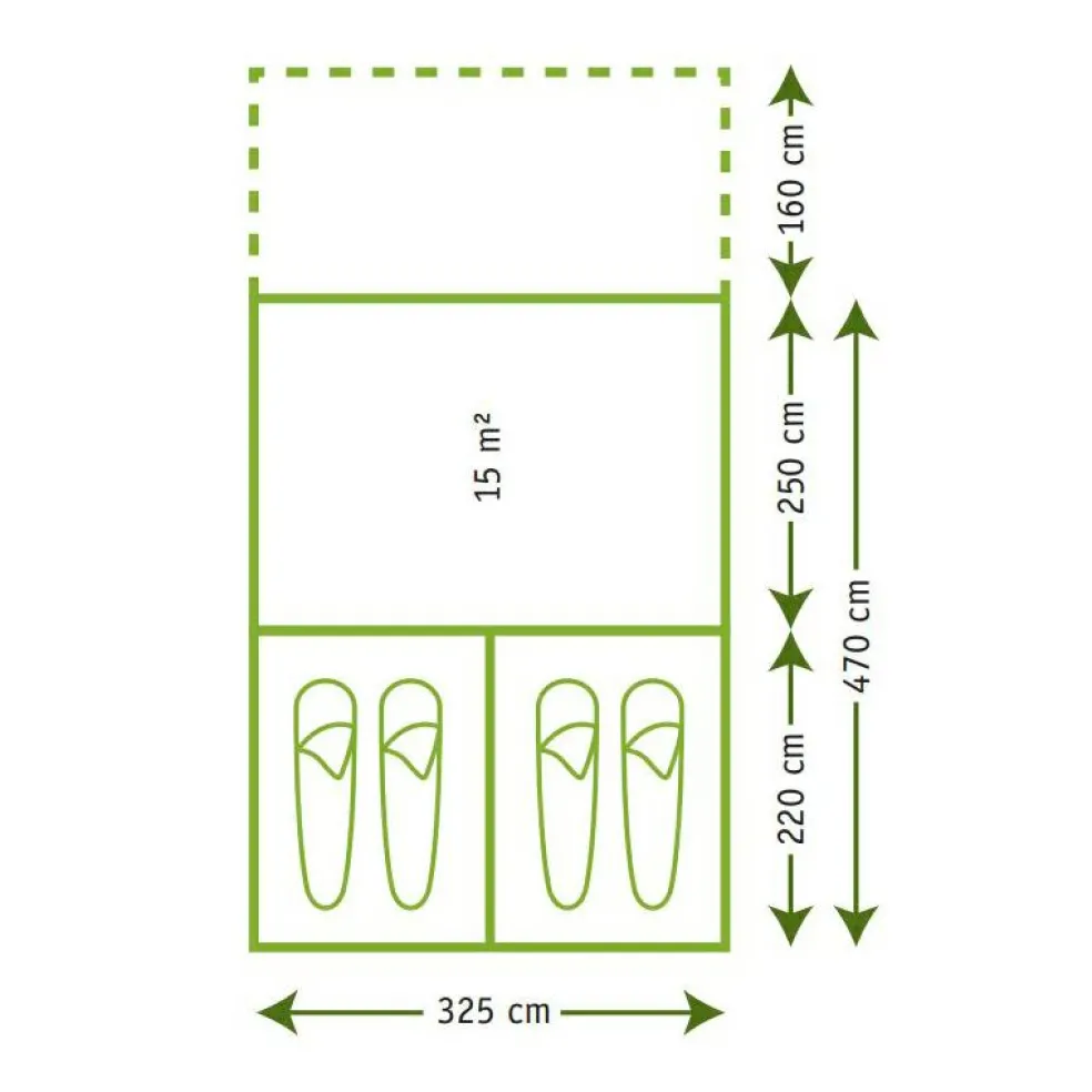 De leefruimte meet circa 250 x 325 cm en is groot genoeg voor een tafel met stoelen of een compacte keukenset. De afmetingen van de slaapcabines zijn ca. 220 x 160 cm. Dat is comfortabel voor twee personen per cabine, met plek voor brede slaapmatten of luchtbedden en bagage aan het voeteneinde. Voor de tent bevindt zich de aanritsbare luifel (ca. 160 x 325 cm) die als droge instap fungeert en tegelijk een beschutte buitenplek biedt bij zon en regen.